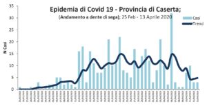 In provincia di Caserta il trend sembra essere costante nel tempo, caratterizzato secondo lo studio da andamento “a dente di sega“, dovuto in parte all’organizzazione della raccolta e analisi dei campioni e in parte alla progressiva individuazione di focolai in residenze sanitarie assistenziali.