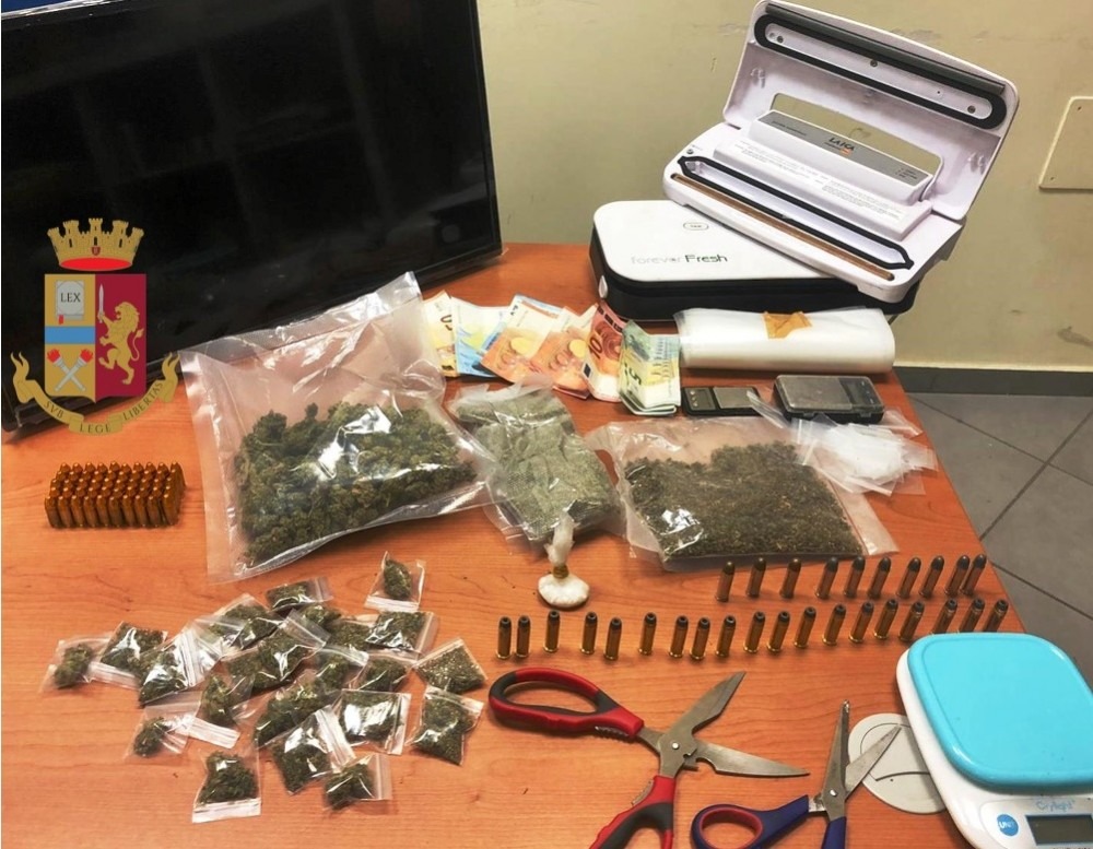 Inoltre, nel garage in uso all’uomo, sono stati sequestrati settantanove proiettili di vario calibro, tre bilancini, diverso materiale per il confezionamento della droga e un monitor collegato ad un sistema di video sorveglianza. A. F., venticinquenne napoletano con precedenti di polizia, è stato arrestato per detenzione abusiva di munizioni e per detenzione e spaccio di sostanze stupefacenti.