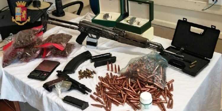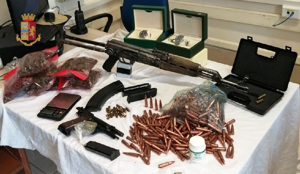 Le perquisizioni hanno permesso ai Poliziotti di scoprire, in un vaso, 6 buste con 412 grammi di marijuana, una bustina con 3,7 grammi della stessa sostanza, un bilancino, materiale per il confezionamento della droga,30 cartucce di vario calibro, due caricatori, uno dei quali con 13 cartucce. Le ispezioni sono proseguite in altre stanze dell’appartamento, e sotto un materasso hanno trovato una pistola Beretta cal. 9×21 con matricola abrasa caricata con 13 cartucce e una in canna, mentre, sul balcone, hanno rinvenuto un fucile mitragliatore d’assalto AK47 Kalashnikov caricato con 30 cartucce cal. 7.62×39 da guerra nonché 420 cartucce dello stesso calibro; infine, in un’altra camera da letto, hanno trovato due orologi di un noto marchio.