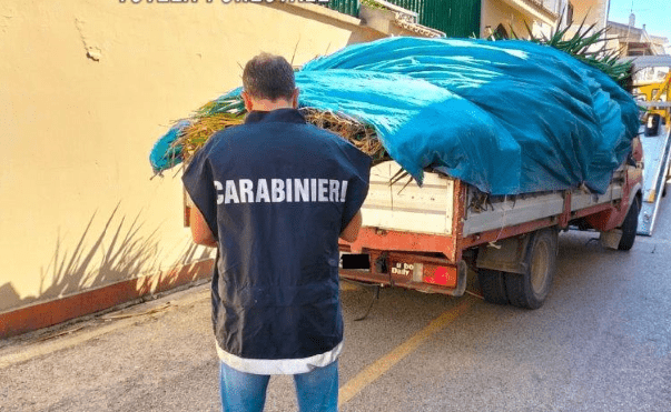 Dal cassone del mezzo, non iscritto all’albo dei gestori ambientali, venivano riversati a terra sfalci e potature, insieme a vinacce, classificati come rifiuti speciali non pericolosi. L’autocarro era già carico di materiale analogo, frutto di attività di manutenzione del verde privato. Sul terreno, i militari hanno accertato la presenza di rami di palma depositati su un cumulo di ceneri, probabile risultato di precedenti roghi di rifiuti effettuati nella stessa area, stimata in circa 50 metri quadrati.