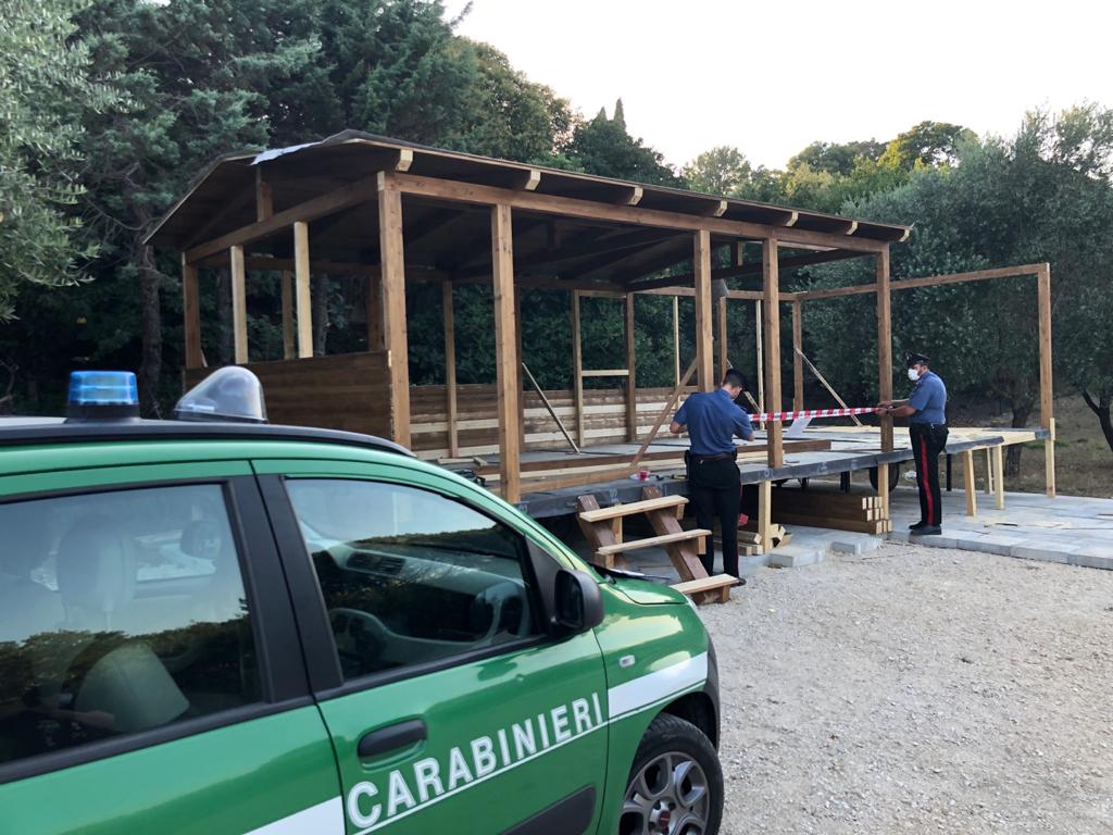 Inoltre, i militari dell’Arma hanno scoperto una porzione di strada, non ancora ultimata, a fondo calcare (ovvero formata da pietrisco di cava misto a materiali cretosi) che inizia dalla strada statale 87 fino ad arrivare al suddetto fondo agricolo. Infine si include anche la presenza di un piazzale a fondo calcare tramite la posa in opera di ghiaia mista a materiale cretoso, per giunta in parte pavimentato con blocchi in calcestruzzo prefabbricati.