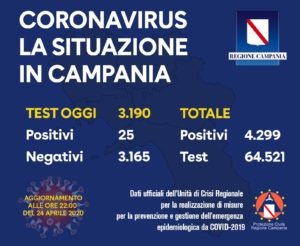 Sperimentale del Mezzogiorno 669 tamponi di cui 4 positivi; all’ospedale di Nola sono stati esaminati 93 tamponi di cui 1 positivo; all’ospedale San Pio di Benevento sono stati esaminati 84 tamponi, di cui 0 positivi; all’ospedale di Eboli sono stati esaminati 96 tamponi, di cui 0 positivi; al Laboratorio di biotecnologie avanzate del Ceinge: sono stati esaminati 98 tamponi, di cui 1 risultato positivo. I numeri dei positivi giunti in serata sono 25 su 3.190 tamponi effettuati. I positivi in Campania in totale comunicati dall’Unità di crisi finora è di 4.299 (al complessivo positivi pari a 4.307 sono stati sottratti gli 8 casi relativi a soggetti asintomatici che, come da comunicazione dell’ospedale Moscati di Avellino, dall’esame di ulteriori due tamponi successivi, sono risultati negativi). Il totale complessivo di tamponi effettuati è pari a 64.521.