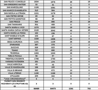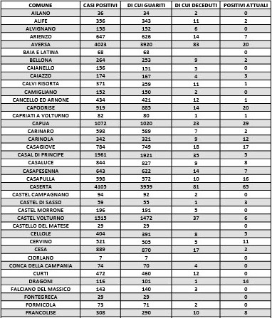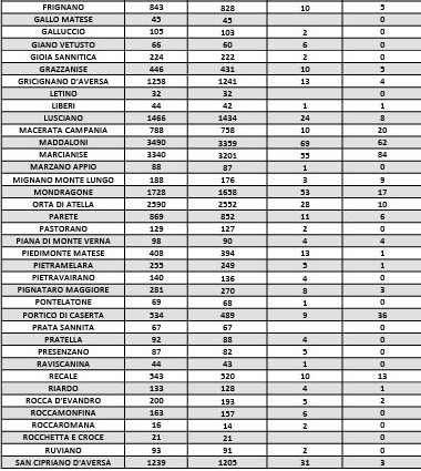 Ad Aversa i positivi sono 20, ma i dati della città normanna vanno letti tenendo conto anche dei casi nei Comuni dell’intero Agro, area densamente popolata con i centri abitati tutti adiacenti tra loro. Questi i dati riferiti alle singole realtà territoriali: le persone attualmente positive sono 2 a Carinaro, 8 a Casaluce, 2 a Cesa, 4 a Gricignano d’Aversa, 8 a Lusciano, 6 a Parete, 3 a Teverola, 12 a Trentola Ducenta. Negli altri centri la situazione è la seguente: Casal di Principe conta 5 contagi, Casapesenna 7, Frignano 5, Orta di Atella 10, San Cipriano d’Aversa 3, San Marcellino 3, Sant’Arpino 3, Succivo 4, Villa di Briano 8 e Villa Literno 2.