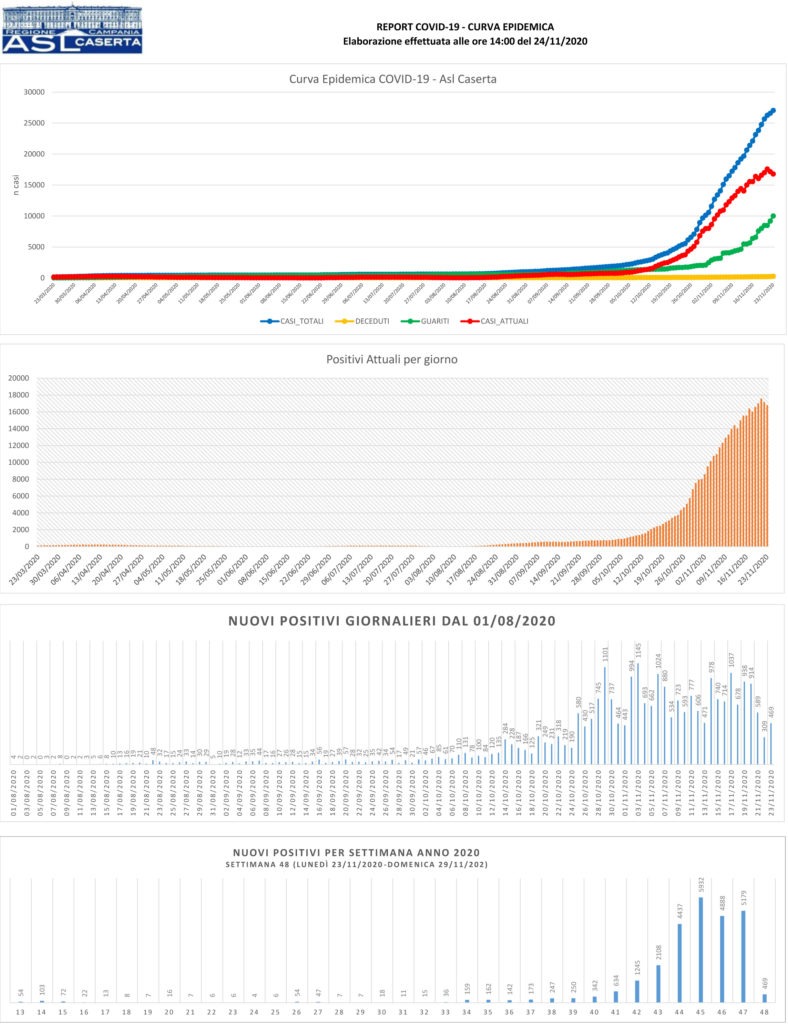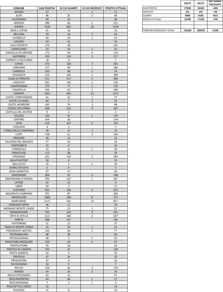 Il bollettino quotidiano diffuso dalla Asl di Caserta e aggiornato alle 14 di oggi fa emergere un dato decisamente preoccupante: nelle scorse ventiquattr’ore, infatti, nella sola provincia di Caserta sono stati registrati addirittura 24 decessi a causa dell’infezione da Covid-19 e delle sue conseguenze. Il numero complessivo delle morti per Coronavirus in Terra di lavoro dall’inizio della pandemia a oggi sale, dunque, da 227 a 251. Dai rilievi effettuati nella giornata di ieri, sono emersi 469 nuovi positivi su 2.184 tamponi effettuati, con una percentuale quindi decisamente elevata e un totale che arriva a 27.038 rispetto ai 26.569 del giorno prima. Vi sono state, per fortuna, anche 815 guarigioni, che fanno calare il numero di coloro che sono attualmente positivi di 370 unità, dai 17.159 del 22 novembre ai 16.789 di ieri.
