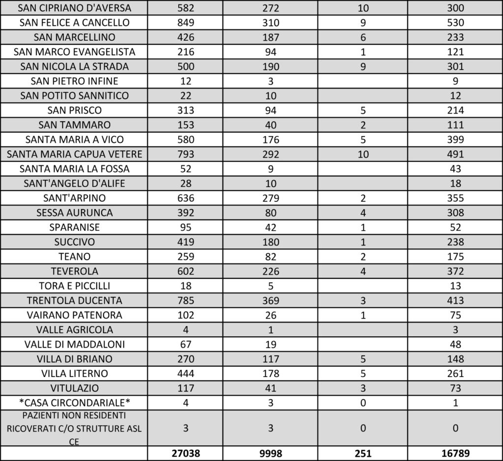 Anche nel bollettino odierno, resta Aversa la città del Casertano col maggiore numero di casi di positività, 1.210, anche se rispetto a ventiquattr’ore prima, quando erano 1.243, il numero è calato, grazie a ben 31 guarigioni e, purtroppo, a due decessi, che fanno salire il numero totale nella città normanna da 16 a 18. Di fronte a una situazione così seria, ieri il sindaco Alfonso Golia aveva annunciato attraverso un post sulla sua pagina Facebook la sospensione delle attitivà didattiche in aula ancora per una decina di giorni almeno. “Considerando il quadro epidemiologico nella nostra città e non solo, ho disposto – aveva scritto Golia – la sospensione dell’attività didattica in presenza fino al prossimo 3 dicembre, data in cui è prevista la scadenza della zona rossa, seguendo quanto era già stabilito dall’ordinanza 90 della Regione Campania fino a oggi. In questo particolare momento, la prudenza resta un obbligo imprescindibile per tutti noi. Chiedo a tutta la comunità scolastica di resistere ancora un po’ sperando che la curva dei contagi nella nostra città cali. Un caro saluto agli studenti e alle loro famiglie“.