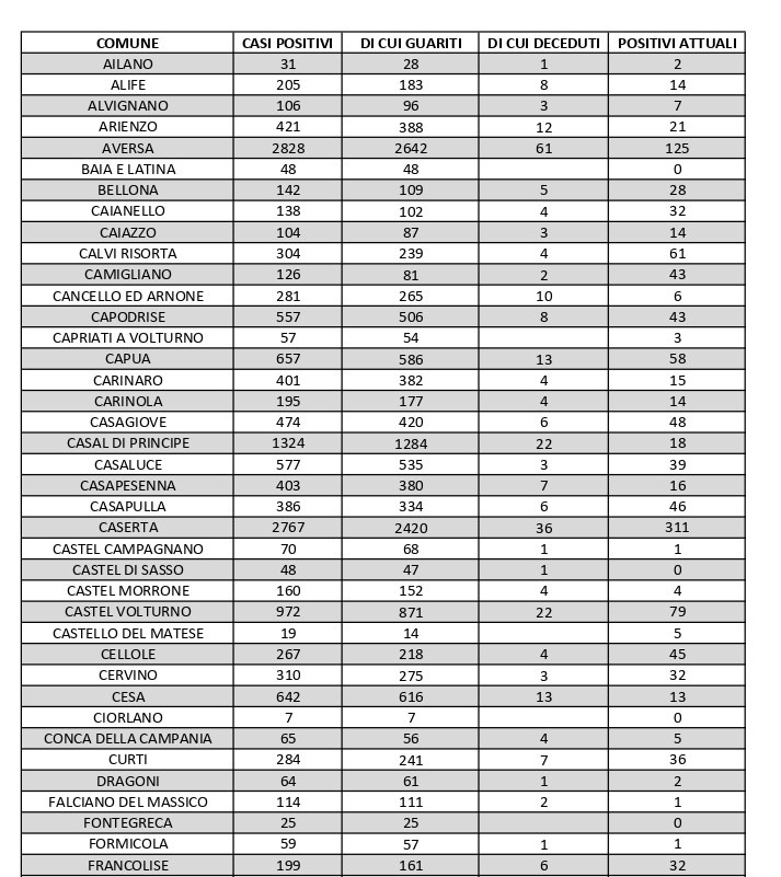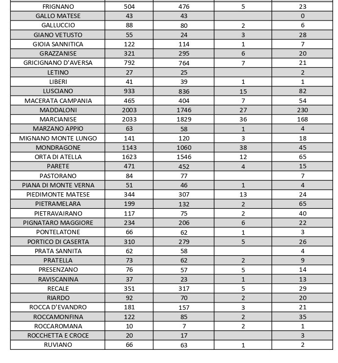 Al di fuori dell’Agro aversano, vanno segnalati i numeri relativi ad altri grossi centri della provincia, nei quali la situazione dei contagi attivi al momento è la seguente: ve ne sono 58 a Capua, 48 a Casagiove, 79 a Castel Volturno, 45 a Mondragone, 65 a Pietramelara, 78 a San Nicola la Strada, 85 a Santa Maria a Vico, 114 a Teano e 30 a Villa Literno.