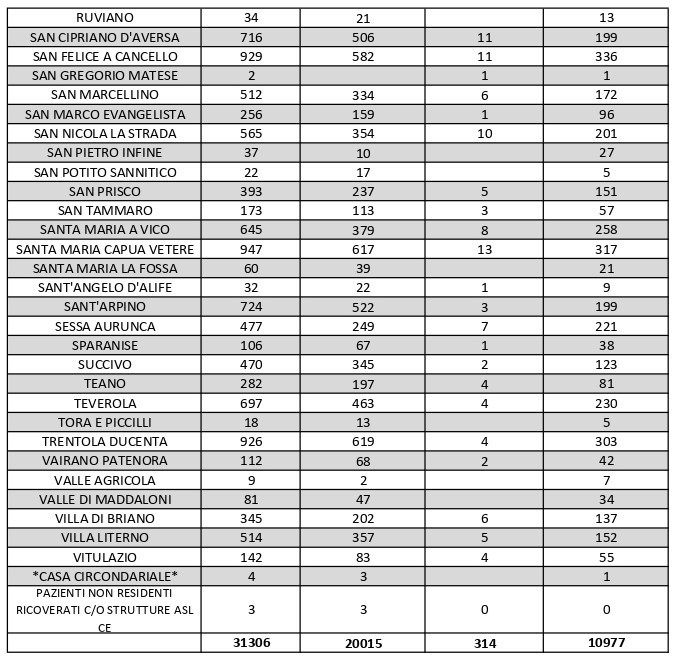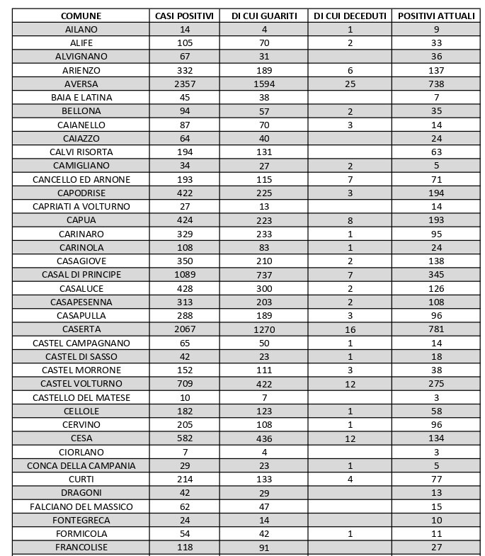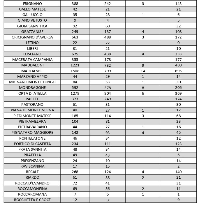 Anche nel bollettino odierno resta il capoluogo Caserta la città col maggiore numero di casi di positività in provincia, 781. Gli occhi restano ancora puntati, in particolare, sull’Agro aversano, dove Aversa fa registrare 738 persone attualmente positive, mentre negli altri centri adiacenti si registrano i seguenti numeri relativi al numero attuale di contagi: Carinaro 95, Casal di Principe 345, Casaluce 126, Casapesenna 108, Cesa 134, Frignano 143, Gricignano d’Aversa 172, Lusciano 233, Orta di Atella 369, Parete 124, San Cipriano d’Aversa 199, San Marcellino 172, Sant’Arpino 199, Succivo 123, Teverola 230, Trentola Ducenta 303, Villa di Briano 137.