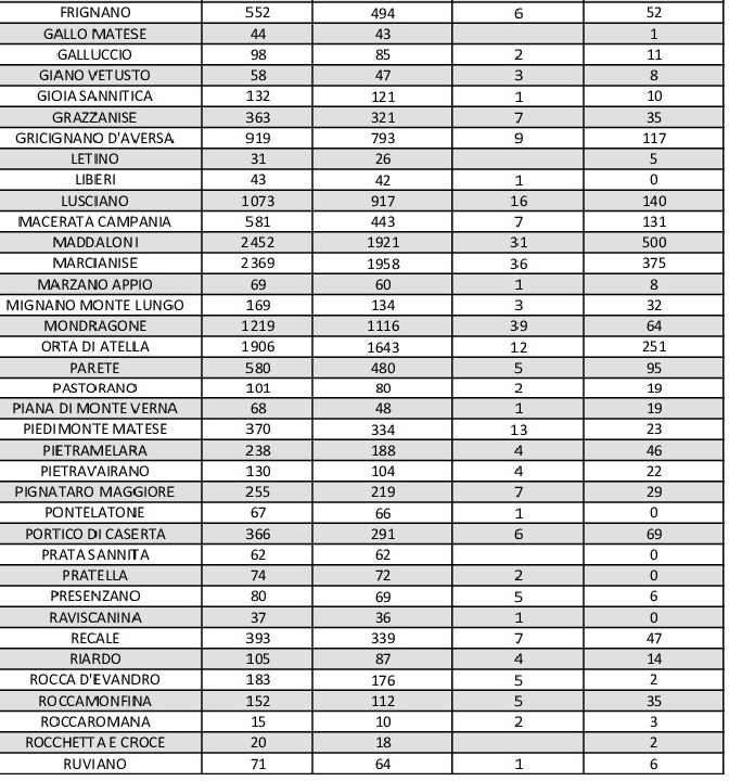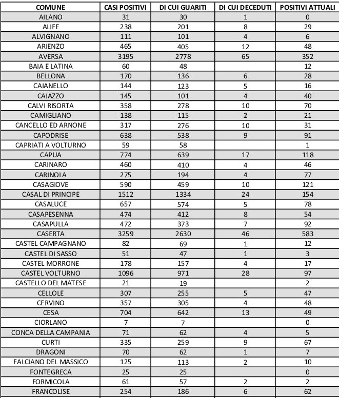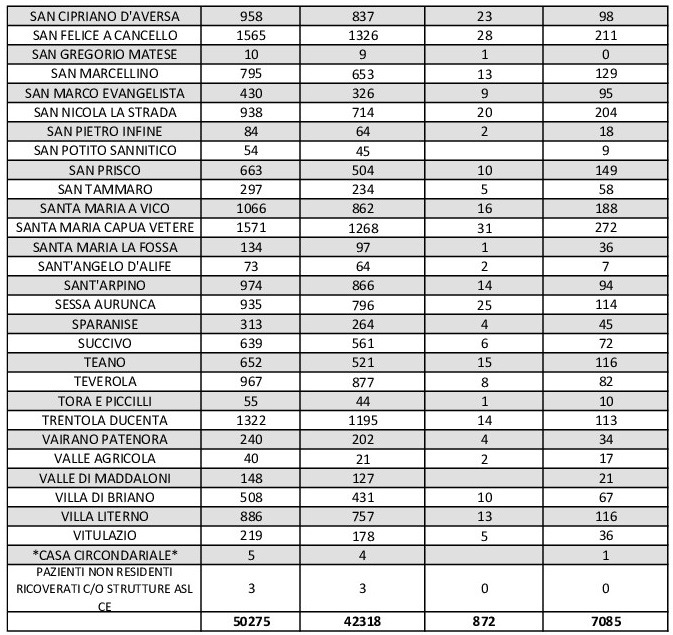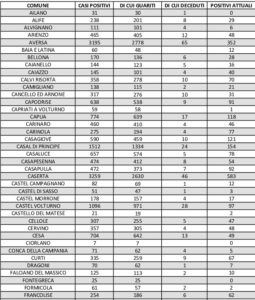 I numeri di Aversa vanno letti tenendo conto anche dei casi dei Comuni dell’intero Agro, area densamente popolata con i centri abitati tutti adiacenti tra loro. Questi i dati riferiti alle singole realtà territoriali: le persone attualmente positive sono 49 a Carinaro, 76 a Casaluce, 50 a Cesa, 123 a Gricignano d’Aversa, 149 a Lusciano, 93 a Parete, 133 a San Marcellino, 86 a Teverola e 118 a Trentola Ducenta. Negli altri centri la situazione è la seguente: Casal di Principe conta 154 contagi, Casapesenna 54, Frignano 58, San Cipriano d’Aversa 104, Sant’Arpino 98, Succivo 76, Villa di Briano 73 e Villa Literno 116.