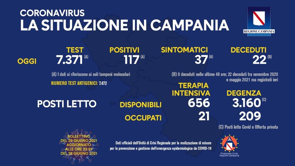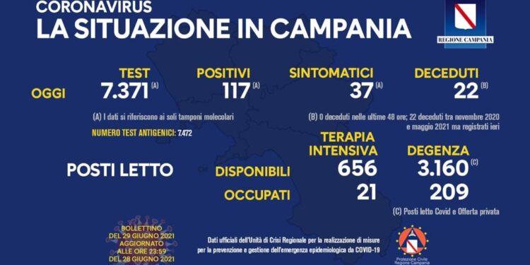 È stato pubblicato poco fa, come ormai da mesi, il bollettino dell’Unità di crisi della Regione Campania che monitora i nuovi positivi al Covid-19 sul nostro territorio. Nelle scorse ventiquattr’ore sono risultate positive al test 117 persone, di cui 37 sintomatiche. Va detto che i dati si riferiscono ai tamponi molecolari, che sono stati 7.371 mentre quelli antigenici sono stati 7.472. Sono stati riscontrati, 22 decessi, 0 nelle ultime 48 ore, i 22 decessi sono relativi al periodo tra novembre 2020 e maggio 2021 ma registrati ieri.