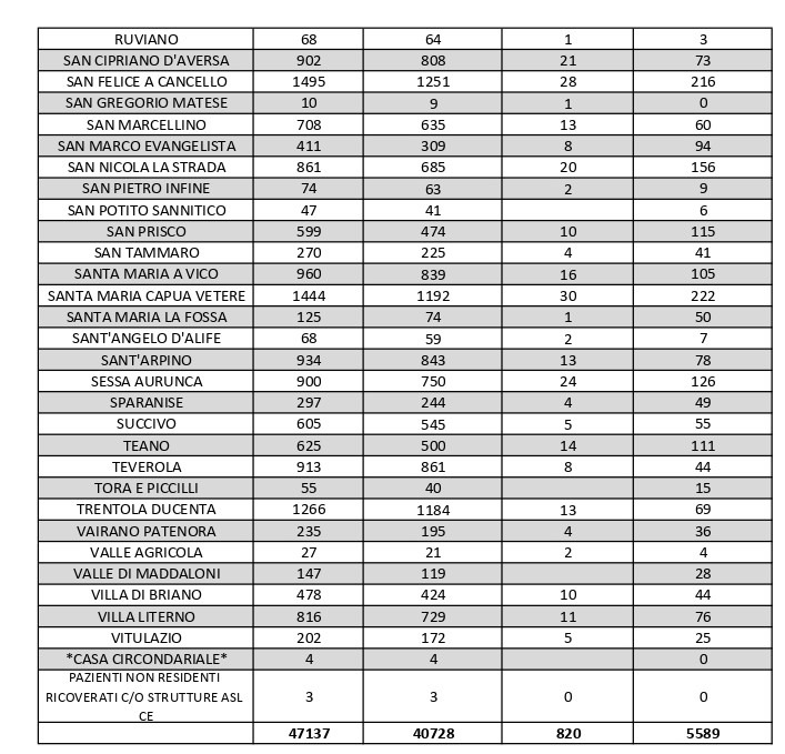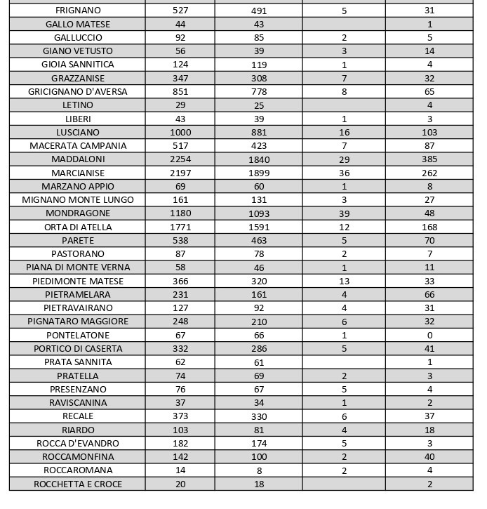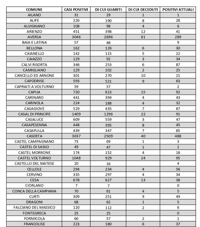 Le guarigioni sono 166. Il centro più colpito rimane il capoluogo (488 positivi), seguito da Maddaloni (385), Aversa (289), Marcianise (262) e Santa Maria Capua Vetere (222). I dati di tutti i Comuni