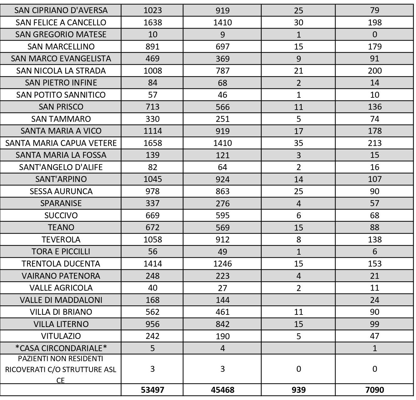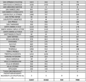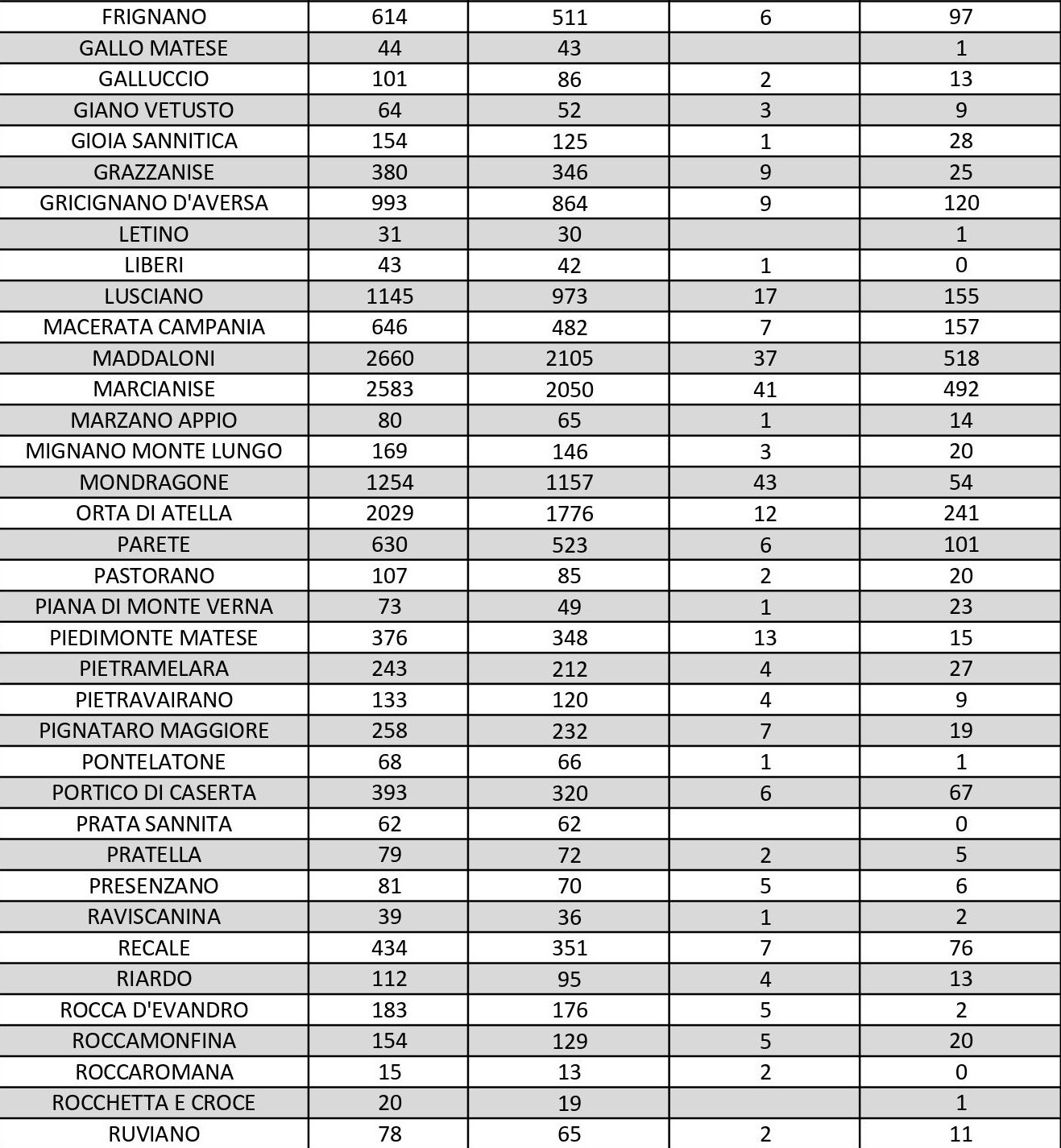 I numeri di Aversa vanno letti tenendo conto anche dei casi dei Comuni dell’intero Agro, area densamente popolata con i centri abitati tutti adiacenti tra loro. Questi i dati riferiti alle singole realtà territoriali: le persone attualmente positive sono 31 a Carinaro, 66 a Casaluce, 49 a Cesa, 120 a Gricignano d’Aversa, 155 a Lusciano, 101 a Parete, 179 a San Marcellino, 138 a Teverola e 153 a Trentola Ducenta. Negli altri centri la situazione è la seguente: Casal di Principe conta 133 contagi, Casapesenna 36, Frignano 97, San Cipriano d’Aversa 79, Sant’Arpino 107, Succivo 68, Villa di Briano 90 e Villa Literno 99.