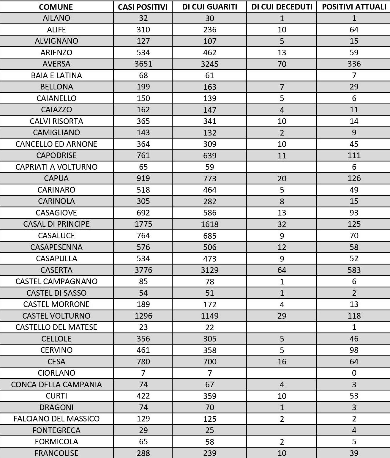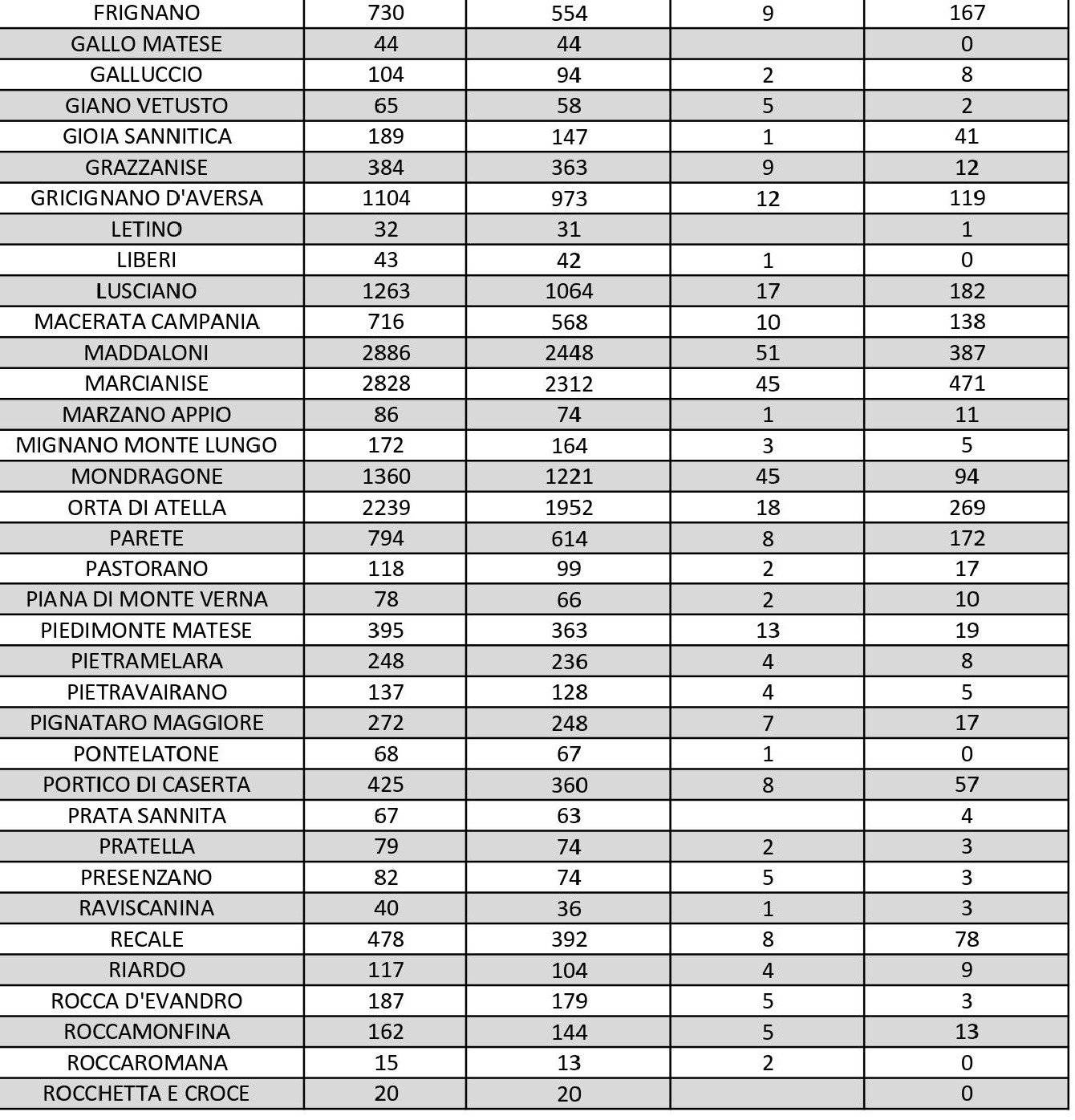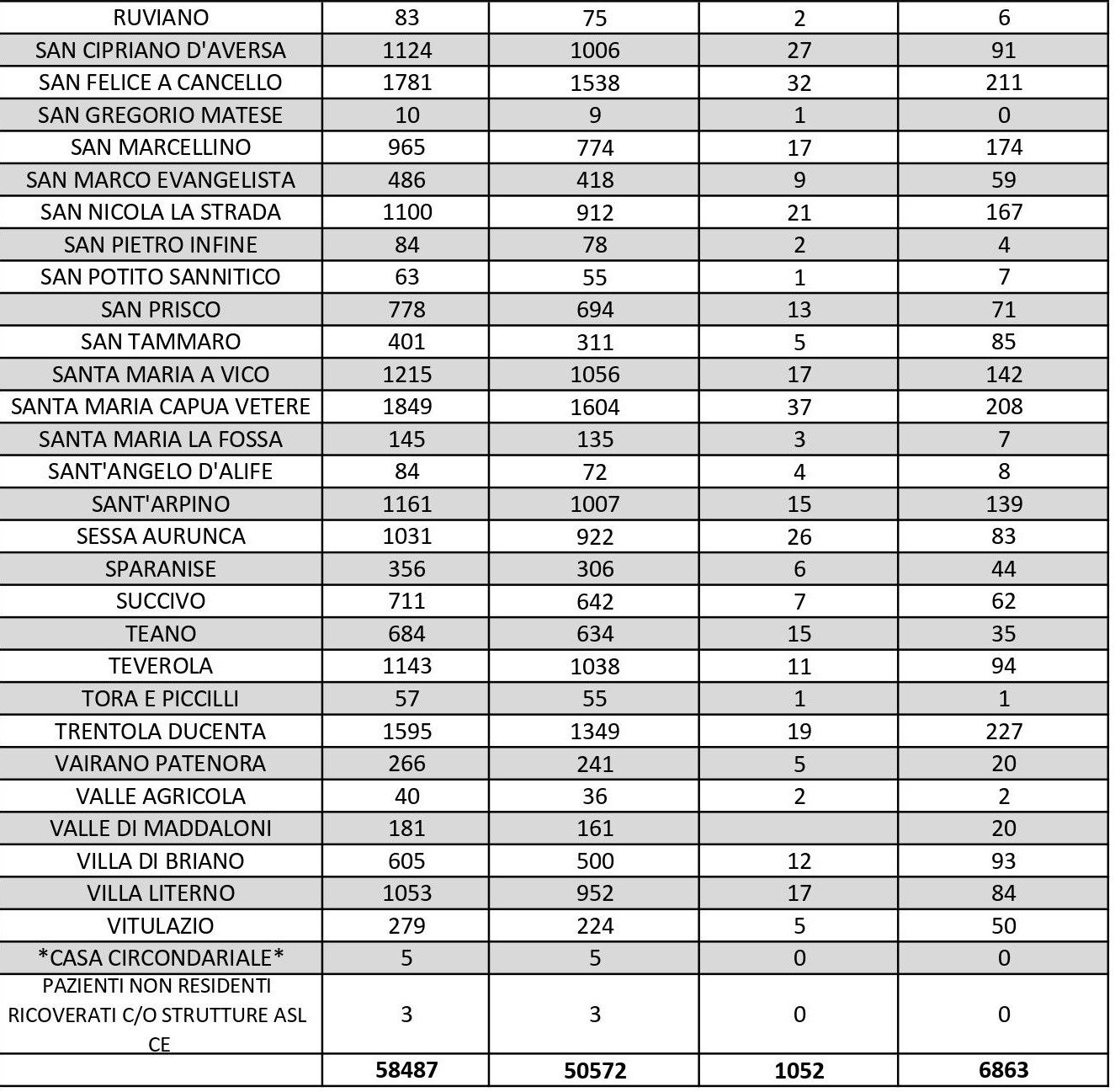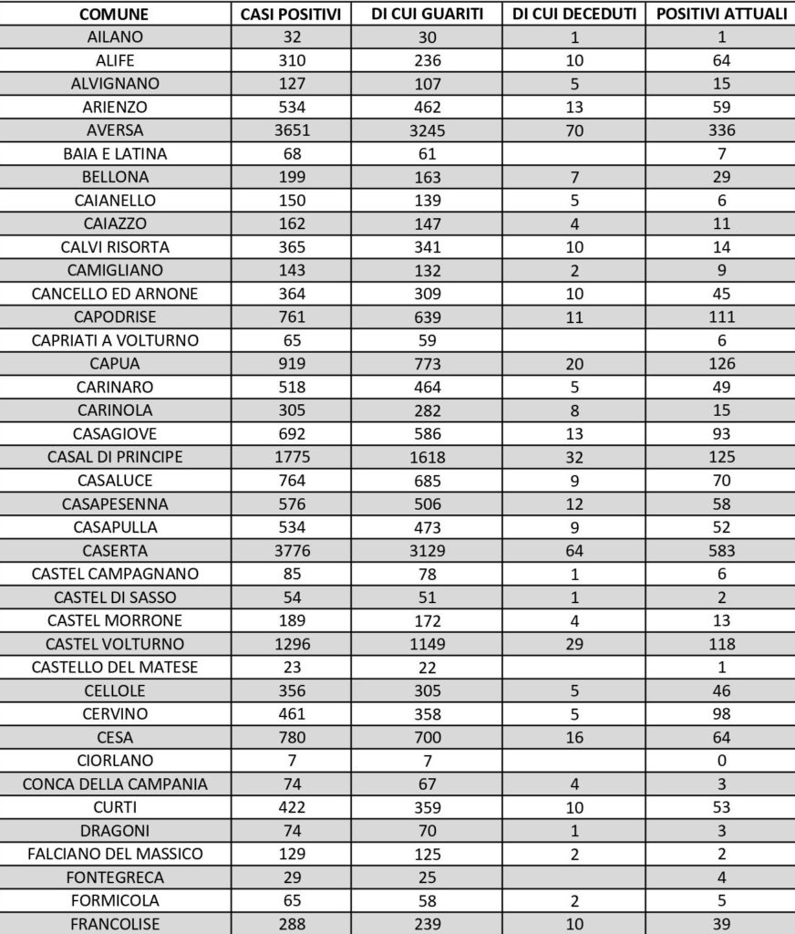 I numeri di Aversa vanno letti tenendo conto anche dei casi dei Comuni dell’intero Agro, area densamente popolata con i centri abitati tutti adiacenti tra loro. Questi i dati riferiti alle singole realtà territoriali: le persone attualmente positive sono 49 a Carinaro, 70 a Casaluce, 64 a Cesa, 119 a Gricignano d’Aversa, 182 a Lusciano, 172 a Parete, 174 a San Marcellino e 94 a Teverola. Negli altri centri la situazione è la seguente: Casal di Principe conta 125 contagi, Casapesenna 58, Frignano 167, San Cipriano d’Aversa 91, Sant’Arpino 139, Succivo 62, Villa di Briano 93 e Villa Literno 84.