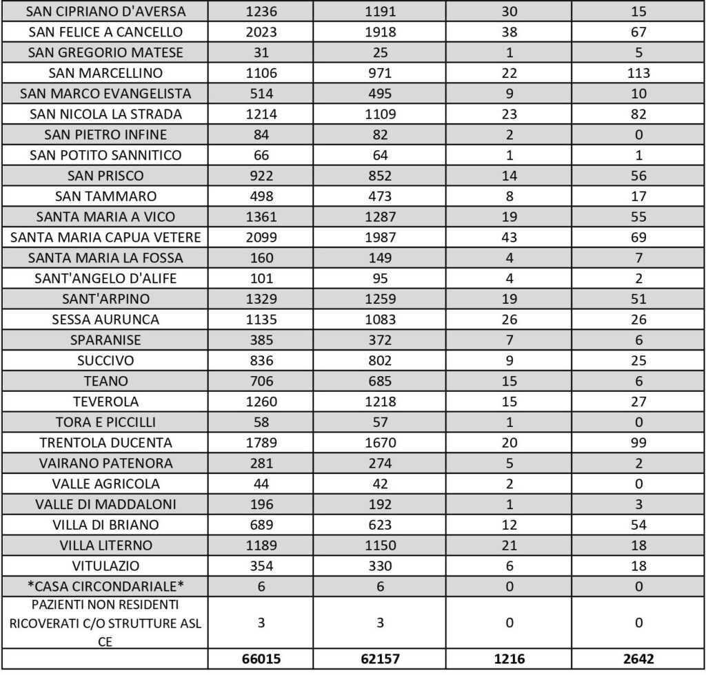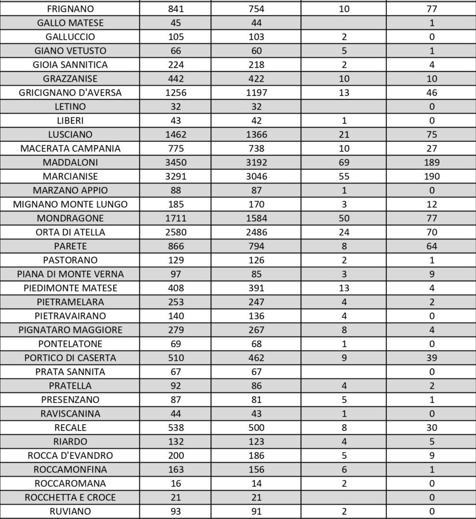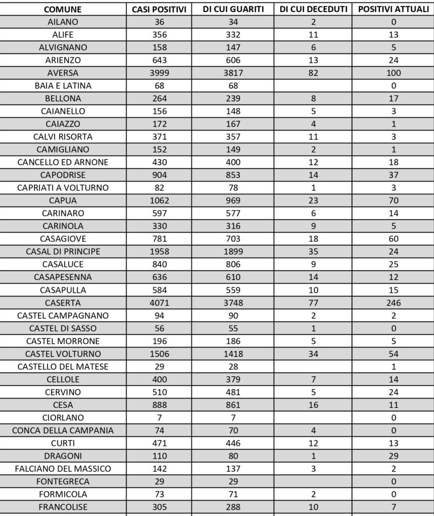 Al di fuori dell’Agro aversano, vanno segnalati i numeri relativi ad altri grossi centri della provincia, nei quali la situazione dei contagi attivi al momento è la seguente: ve ne sono 70 a Capua, 60 a Casagiove, 54 a Castel Volturno, 77 a Mondragone, 67 a San Felice a Cancello, 82 a San Nicola la Strada, 55 a Santa Maria a Vico, 69 a Santa Maria Capua Vetere e 26 a Sessa Aurunca.