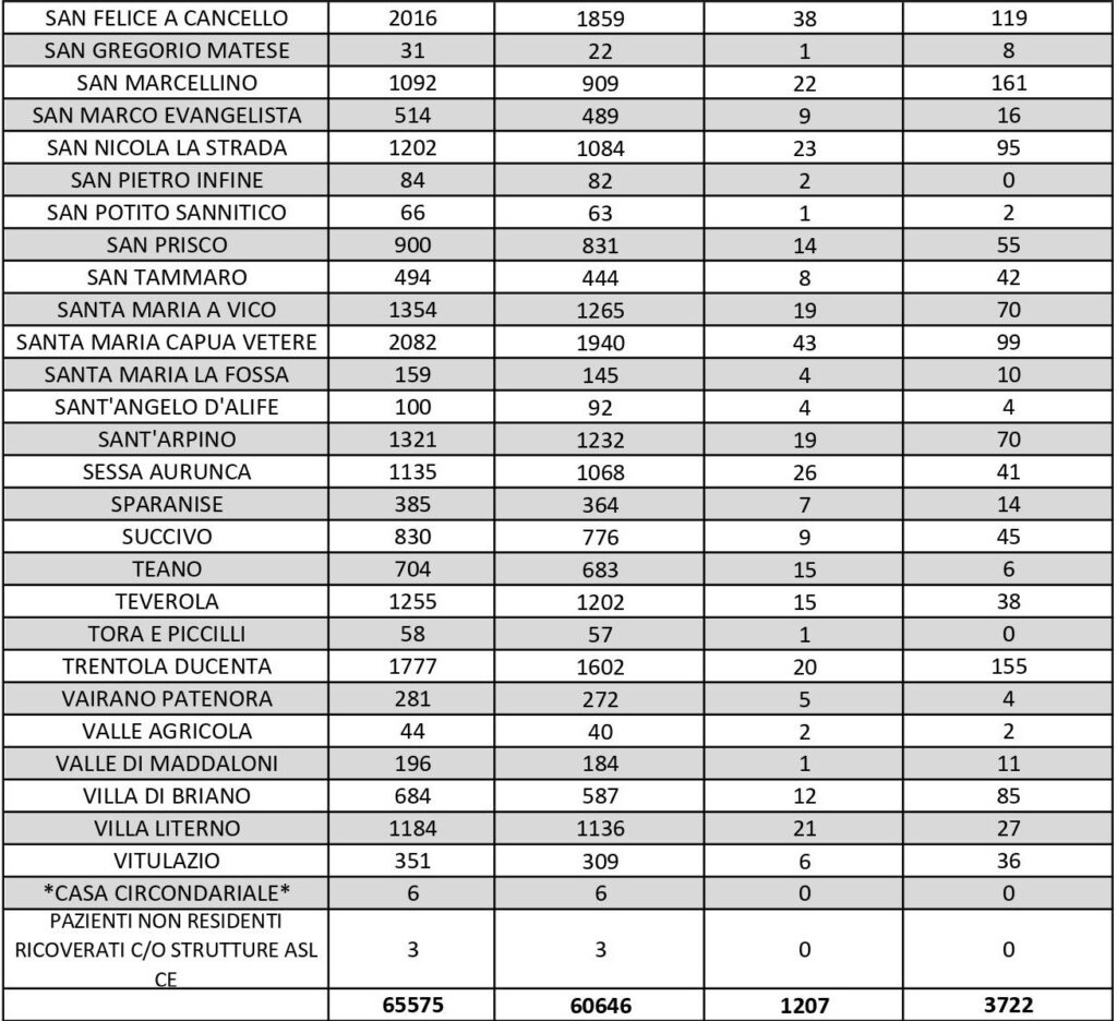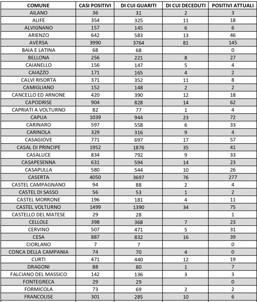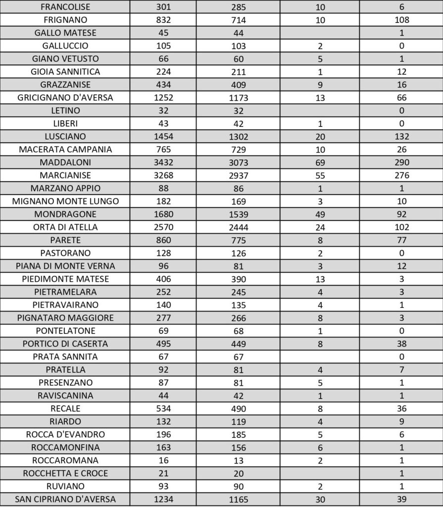 I dati di Aversa vanno letti tenendo conto anche dei casi nei Comuni dell’intero Agro, area densamente popolata con i centri abitati tutti adiacenti tra loro. Questi i dati riferiti alle singole realtà territoriali: le persone attualmente positive sono 33 a Carinaro, 33 a Casaluce, 39 a Cesa, 66 a Gricignano d’Aversa, 132 a Lusciano, 77 a Parete, 38 a Teverola. Negli altri centri la situazione è la seguente: Casal di Principe conta 41 contagi, Casapesenna 23, Frignano 108, Orta di Atella 102, San Cipriano d’Aversa 39, Sant’Arpino 70, Succivo 45, Villa di Briano 85 e Villa Literno 27.