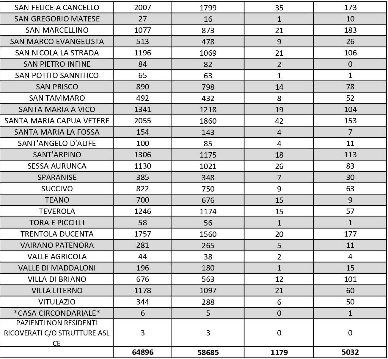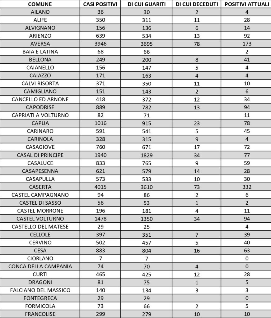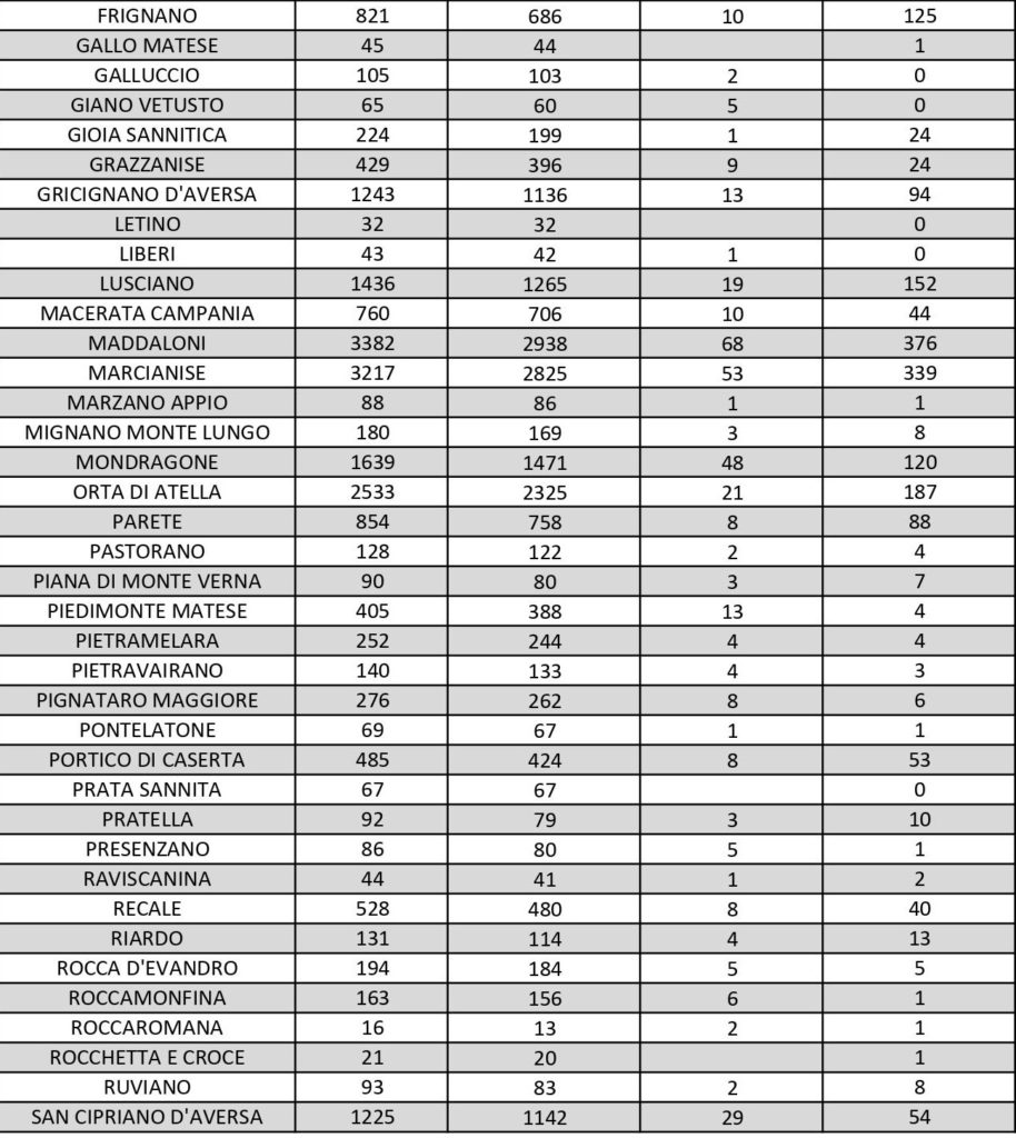 Aversa conta 173 positivi, ma i dati della città normanna vanno letti tenendo conto anche dei casi nei Comuni dell’intero Agro, area densamente popolata con i centri abitati tutti adiacenti tra loro. Questi i dati riferiti alle singole realtà territoriali: le persone attualmente positive sono 45 a Carinaro, 59 a Casaluce, 63 a Cesa, 94 a Gricignano d’Aversa, 152 a Lusciano, 88 a Parete, 57 a Teverola. Negli altri centri la situazione è la seguente: Casal di Principe conta 77 contagi, Casapesenna 28, Frignano 125, San Cipriano d’Aversa 54, Sant’Arpino 113, Succivo 63, Villa di Briano 101 e Villa Literno 60.
