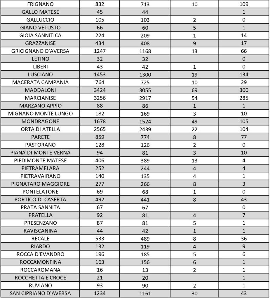 I dati di Aversa vanno letti tenendo conto anche dei casi nei Comuni dell’intero Agro, area densamente popolata con i centri abitati tutti adiacenti tra loro. Questi i dati riferiti alle singole realtà territoriali: le persone attualmente positive sono 35 a Carinaro, 35 a Casaluce, 40 a Cesa, 66 a Gricignano d’Aversa, 134 a Lusciano, 77 a Parete, 44 a Teverola. Negli altri centri la situazione è la seguente: Casal di Principe conta 46 contagi, Casapesenna 25, Frignano 109, Orta di Atella 104, San Cipriano d’Aversa 43, Sant’Arpino 75, Succivo 55, Villa di Briano 91 e Villa Literno 33.