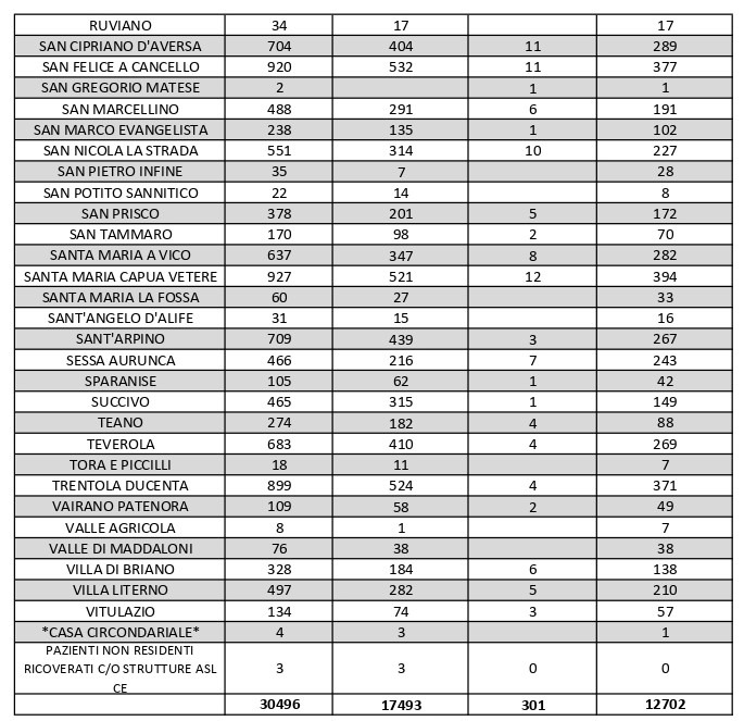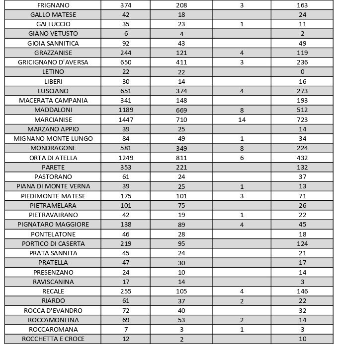 La città più colpita della provincia è al momento Caserta, che conta 860 casi attivi. Seguono Aversa, che si attesta a 813 positivi, Marcianise (723), Maddaloni (512), Casal di Principe (482), Orta di Atella (432), Santa Maria Capua Vetere (394), San Felice a Cancello (377), Trentola Ducenta (371), Castel Volturno (290), San Cipriano d’Aversa (289), Santa Maria a Vico (282), Lusciano (273), Teverola (269), Sant’Arpino (267), Sessa Aurunca (243), Gricignano d’Aversa (236), Capua(230), San Nicola la Strada (227), Mondragone (224), Villa Literno (210), Macerata Campania (193), San Marcellino (191) e Cesa (177). Numeri in discesa, ma ancora alti, si registrano anche nei centri minori dell’Agro aversano: nel Comune di San Marcellino le persone attualmente positive al Coronavirus sono 191, a Frignano 163, a Casapesenna 137, a Villa di Briano 138, a Parete 132 e a Carinaro 116.