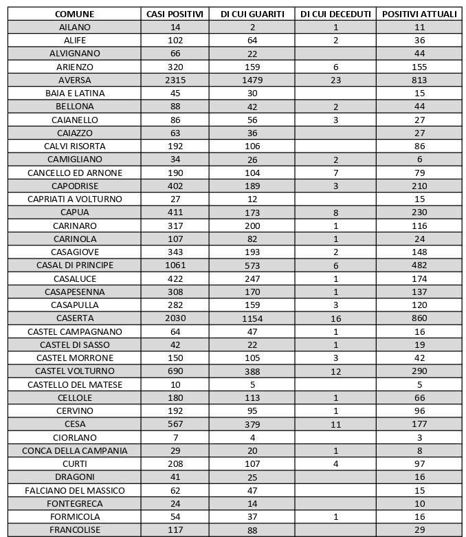 La città più colpita è il capoluogo, che conta 860 contagi attivi. Seguono Aversa (813), Marcianise (723), Maddaloni (512), Casal di Principe (482), Orta di Atella (432), Santa Maria Capua Vetere (394), San Felice a Cancello (377), Trentola Ducenta (371), Castel Volturno (290) e San Cipriano d'Aversa (289)