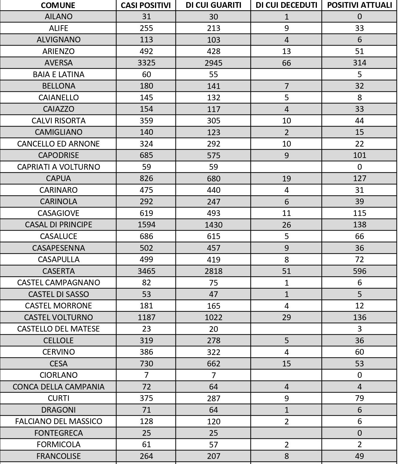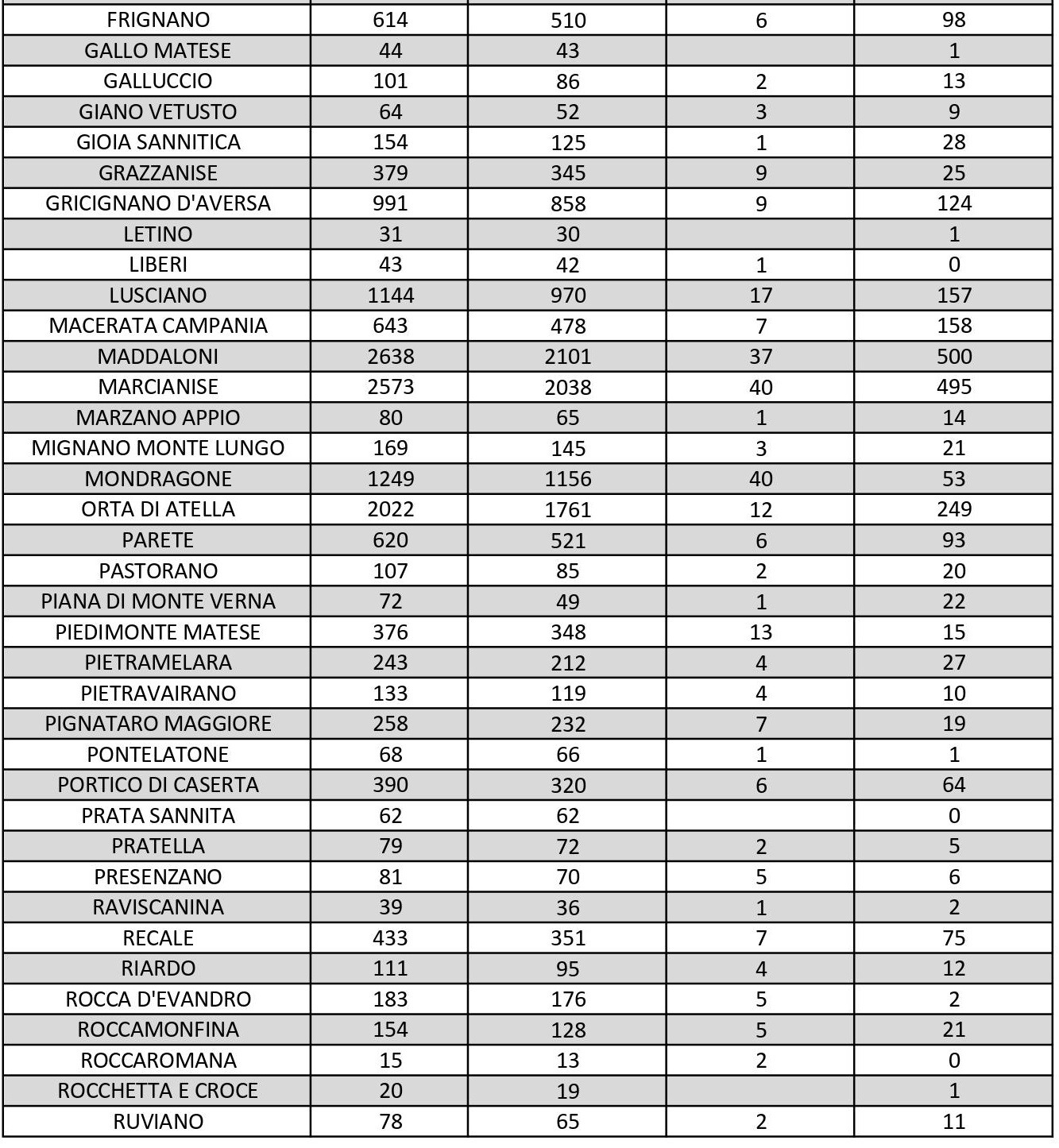 I numeri di Aversa vanno letti tenendo conto anche dei casi dei Comuni dell’intero Agro, area densamente popolata con i centri abitati tutti adiacenti tra loro. Questi i dati riferiti alle singole realtà territoriali: le persone attualmente positive sono 31 a Carinaro, 66 a Casaluce, 53 a Cesa, 124 a Gricignano d’Aversa, 157 a Lusciano, 93 a Parete, 181 a San Marcellino, 133 a Teverola e 157 a Trentola Ducenta. Negli altri centri la situazione è la seguente: Casal di Principe conta 138 contagi, Casapesenna 36, Frignano 98, San Cipriano d’Aversa 79, Sant’Arpino 115, Succivo 73, Villa di Briano 92 e Villa Literno 96.