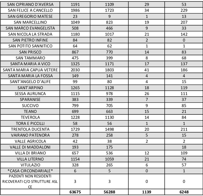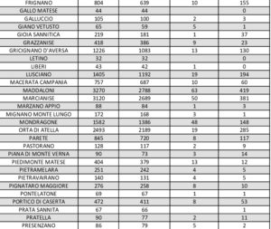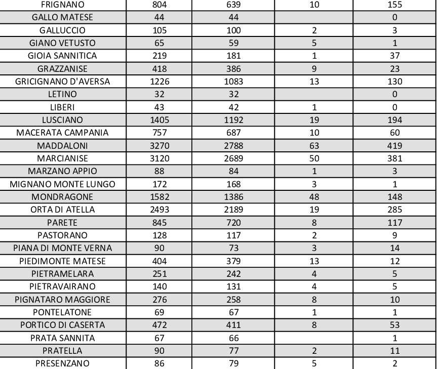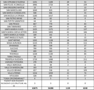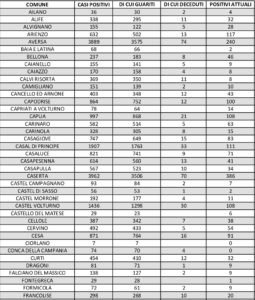 Al di fuori dell’Agro aversano, vanno segnalati i numeri relativi ad altri grossi centri della provincia, nei quali la situazione dei contagi attivi al momento è la seguente: ve ne sono 108 a Capua, 83 a Casagiove, 108 a Castel Volturno, 148 a Mondragone, 142 a San Nicola la Strada, 137 a Santa Maria a Vico, 186 a Santa Maria Capua Vetere, 111 a Sessa Aurunca e 21 a Teano.