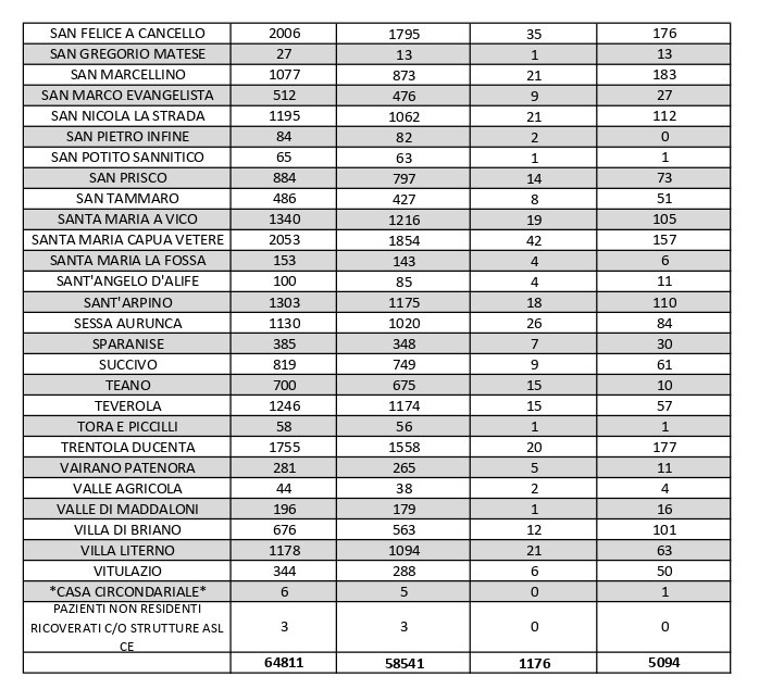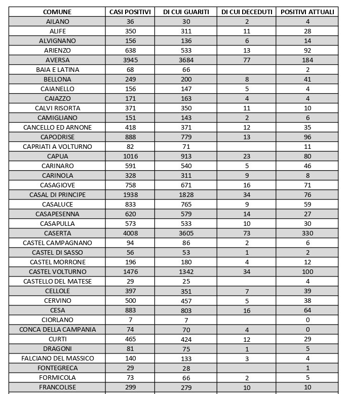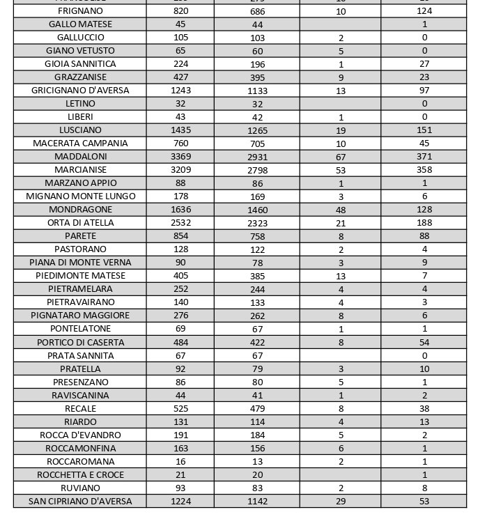 I dati di Aversa vanno letti tenendo conto anche dei casi nei Comuni dell’intero Agro, area densamente popolata con i centri abitati tutti adiacenti tra loro. Questi i dati riferiti alle singole realtà territoriali: le persone attualmente positive sono 46 a Carinaro, 59 a Casaluce, 64 a Cesa, 97 a Gricignano d’Aversa, 151 a Lusciano, 88 a Parete, 57 a Teverola e 177 a Trentola Ducenta. Nei centri siti ai margini dell’Agro aversano la situazione è la seguente: Casal di Principe conta 76 contagi, Casapesenna 27, Frignano 124, San Cipriano d’Aversa 53, Sant’Arpino 110, Succivo 61 e Villa di Briano 101.