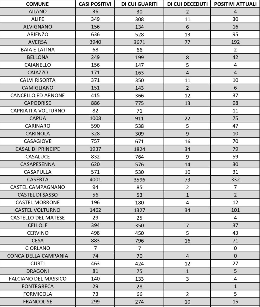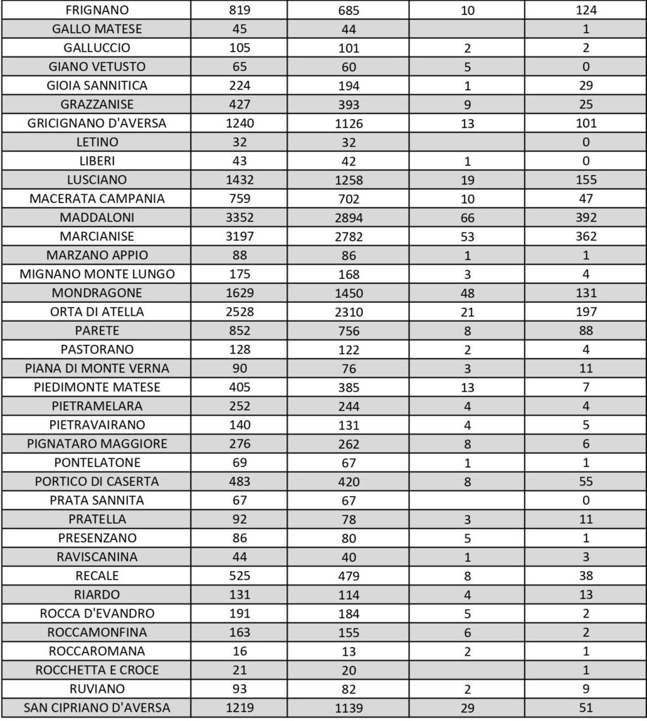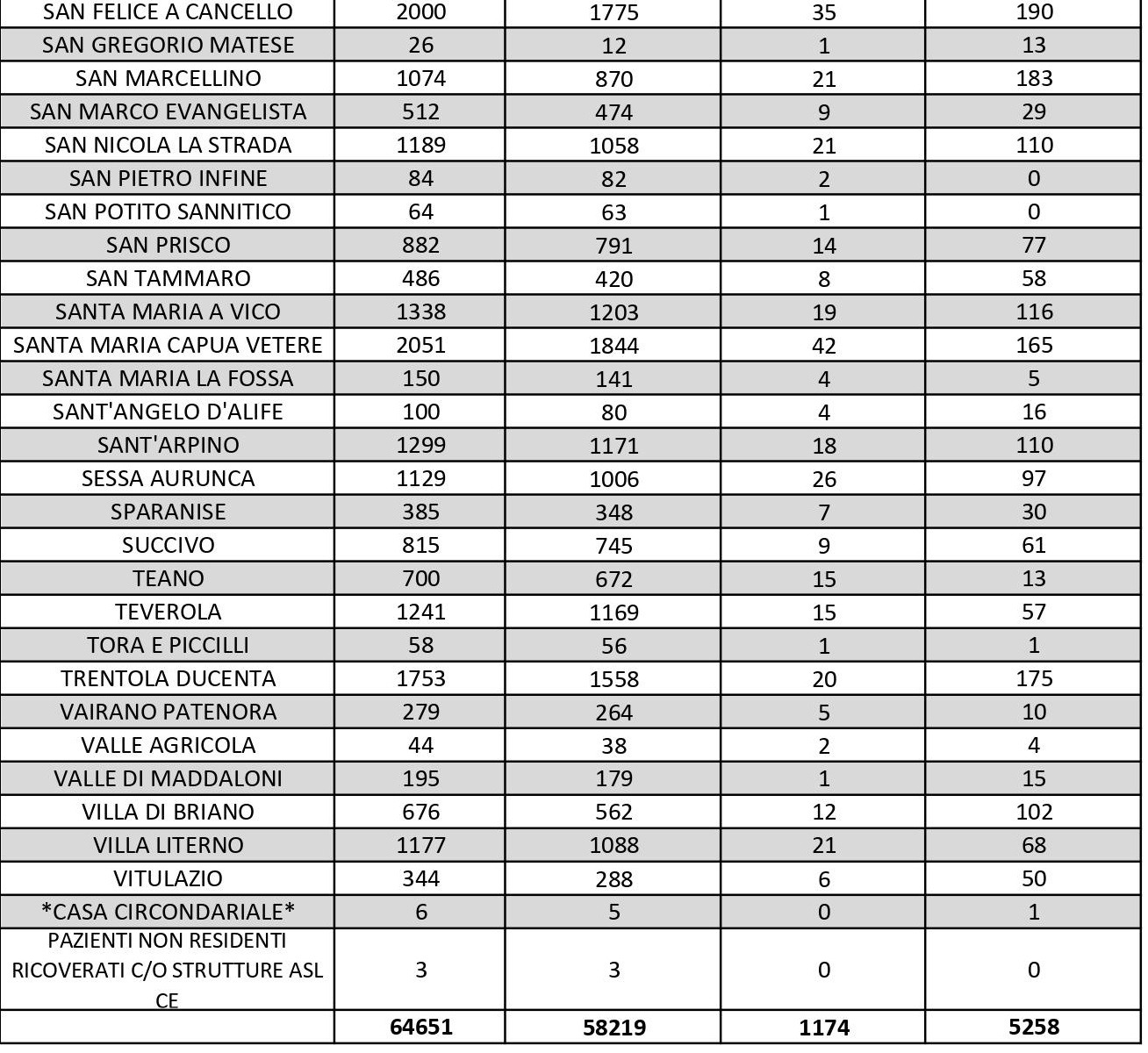 I dati di Aversa vanno letti tenendo conto anche dei casi nei Comuni dell’intero Agro, area densamente popolata con i centri abitati tutti adiacenti tra loro. Questi i dati riferiti alle singole realtà territoriali: le persone attualmente positive sono 47 a Carinaro, 59 a Casaluce, 71 a Cesa, 101 a Gricignano d’Aversa, 155 a Lusciano, 88 a Parete, 57 a Teverola e 175 a Trentola Ducenta. Negli altri centri la situazione è la seguente: Casal di Principe conta 79 contagi, Casapesenna 30, Frignano 124, San Cipriano d’Aversa 51, San Marcellino 183, Sant’Arpino 110, Succivo 61, Villa di Briano 102 e Villa Literno 68.