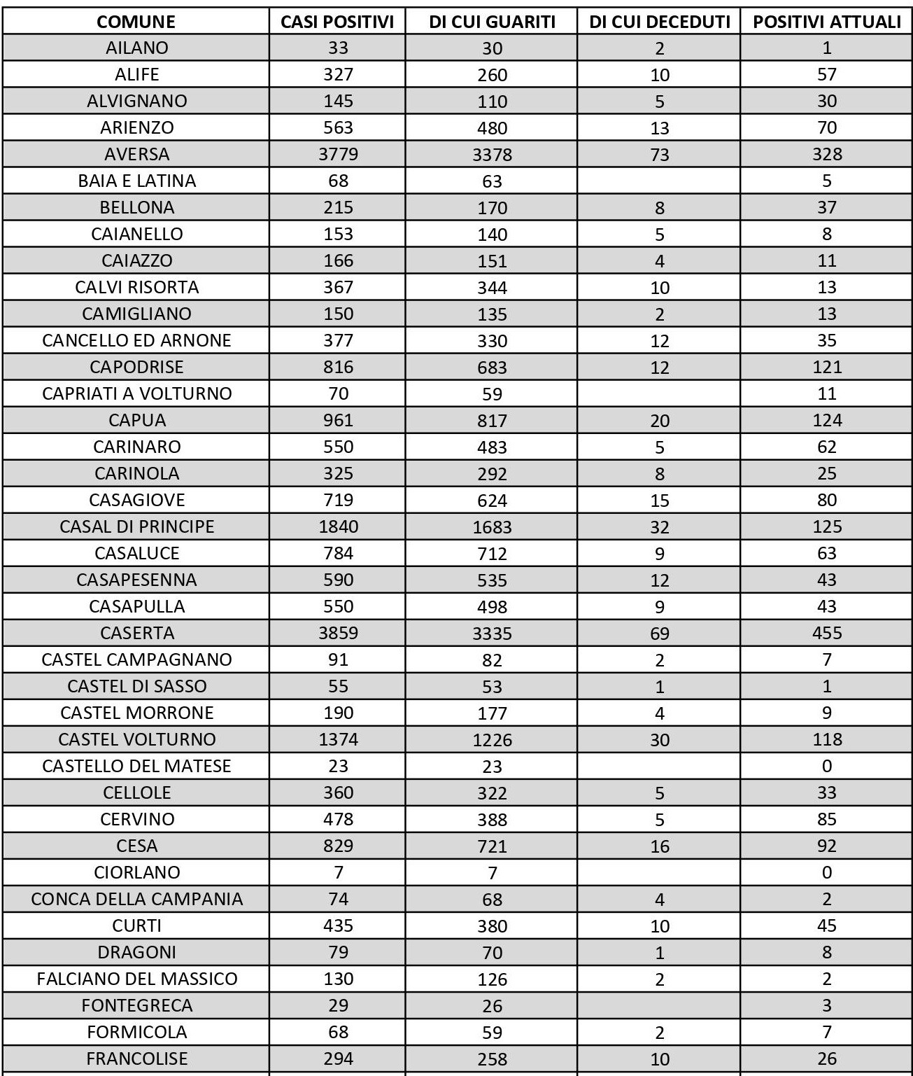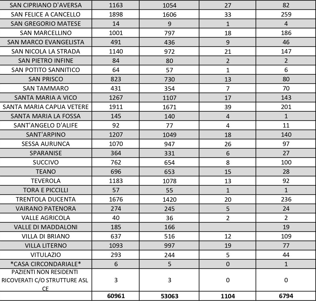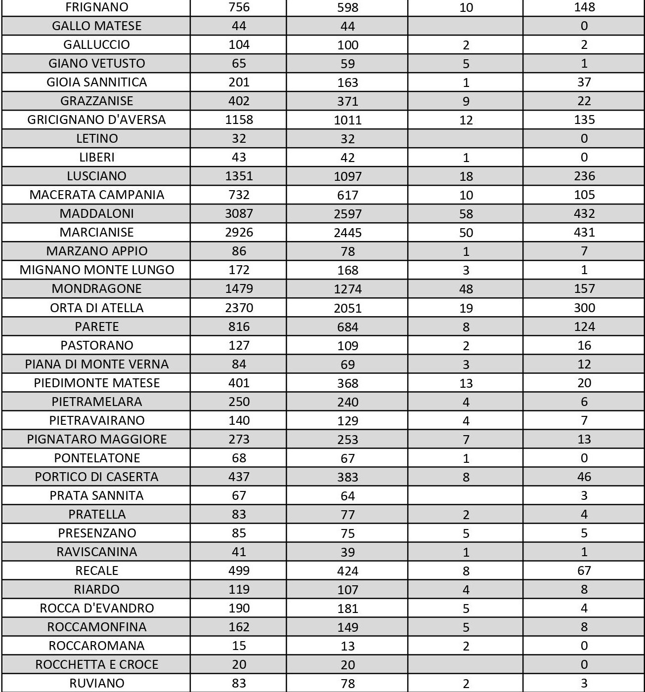 I numeri di Aversa vanno letti tenendo conto anche dei casi dei Comuni dell’intero Agro, area densamente popolata con i centri abitati tutti adiacenti tra loro. Questi i dati riferiti alle singole realtà territoriali: le persone attualmente positive sono 62 a Carinaro, 63 a Casaluce, 92 a Cesa, 135 a Gricignano d’Aversa, 236 a Lusciano, 124 a Parete, 186 a San Marcellino, 92 a Teverola e 236 a Trentola Ducenta. Negli altri centri la situazione è la seguente: Casal di Principe conta 125 contagi, Casapesenna 43, Frignano 148, San Cipriano d’Aversa 82, Sant’Arpino 140, Succivo 100, Villa di Briano 109 e Villa Literno 77.