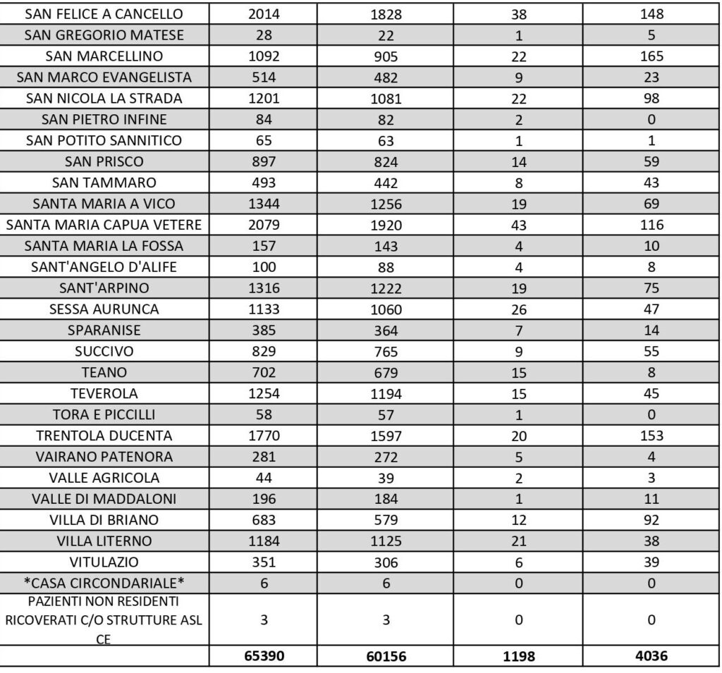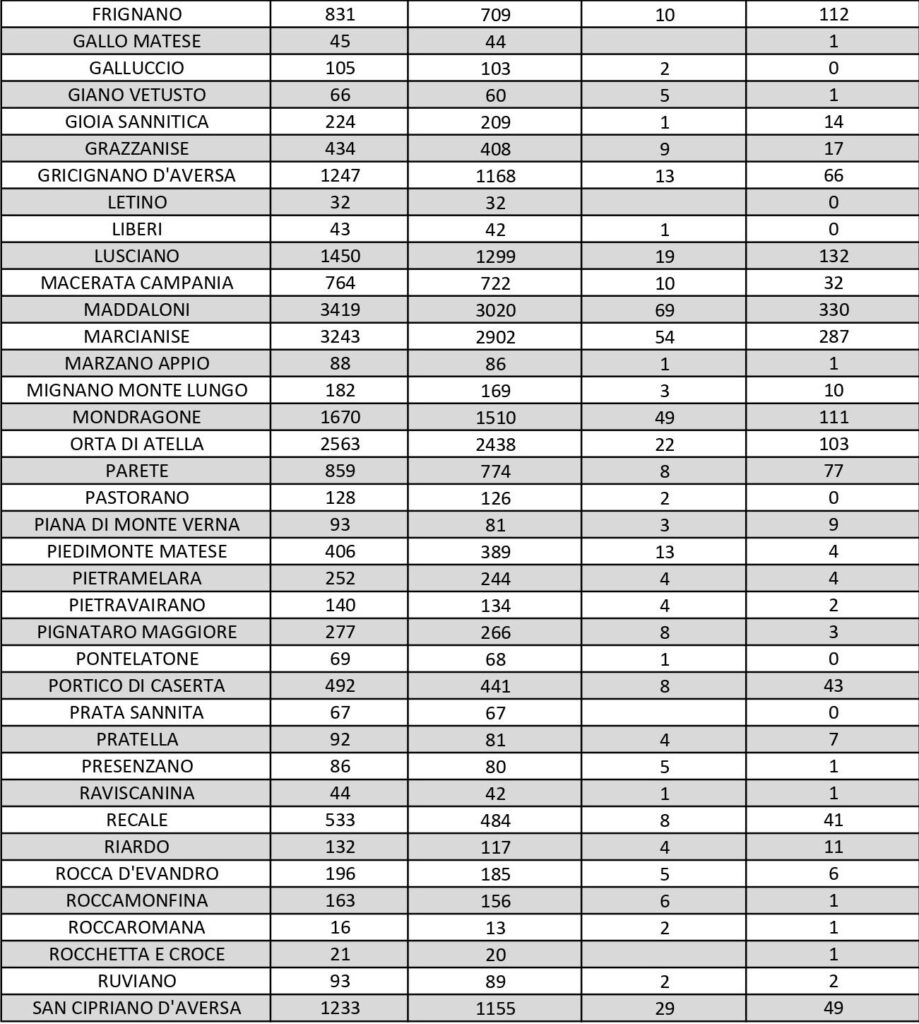 I dati di Aversa vanno letti tenendo conto anche dei casi nei Comuni dell’intero Agro, area densamente popolata con i centri abitati tutti adiacenti tra loro. Questi i dati riferiti alle singole realtà territoriali: le persone attualmente positive sono 35 a Carinaro, 37 a Casaluce, 39 a Cesa, 66 a Gricignano d’Aversa, 132 a Lusciano, 77 a Parete, 45 a Teverola. Negli altri centri la situazione è la seguente: Casal di Principe conta 47 contagi, Casapesenna 24, Frignano 112, Orta di Atella 103, San Cipriano d’Aversa 49, Sant’Arpino 75, Succivo 55, Villa di Briano 92 e Villa Literno 38.