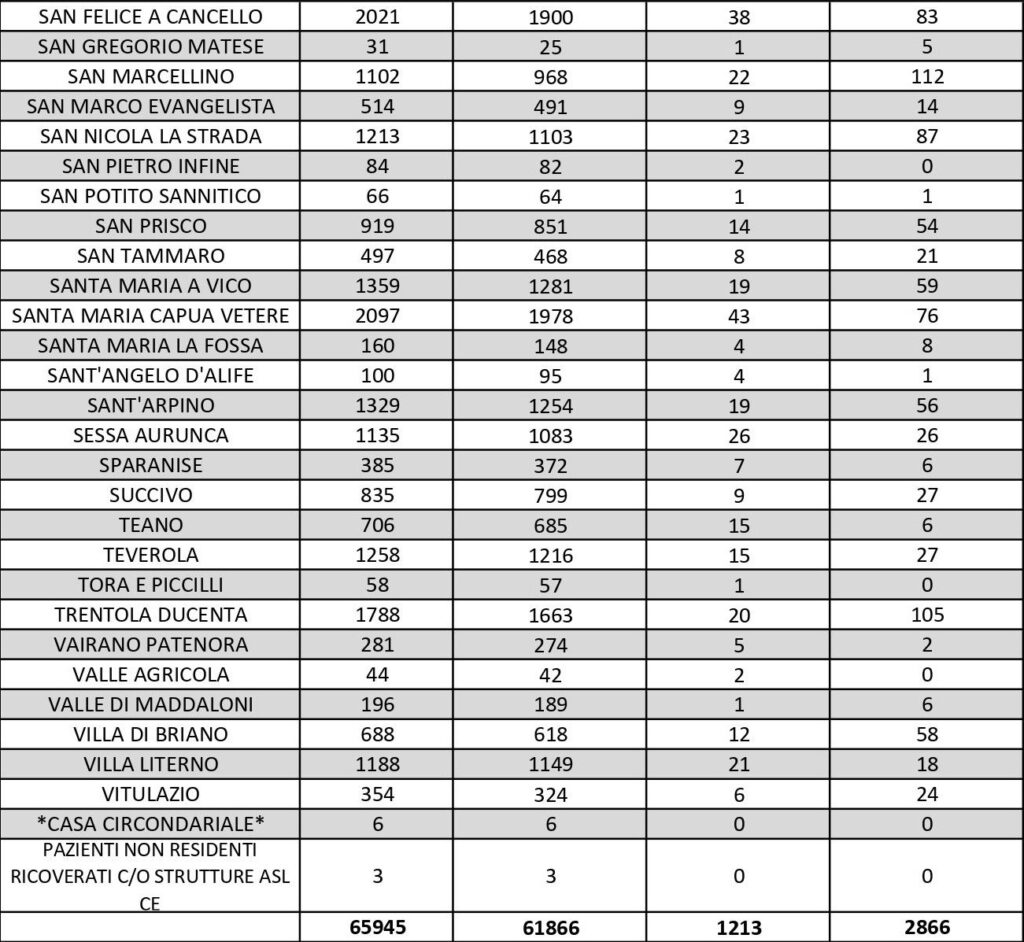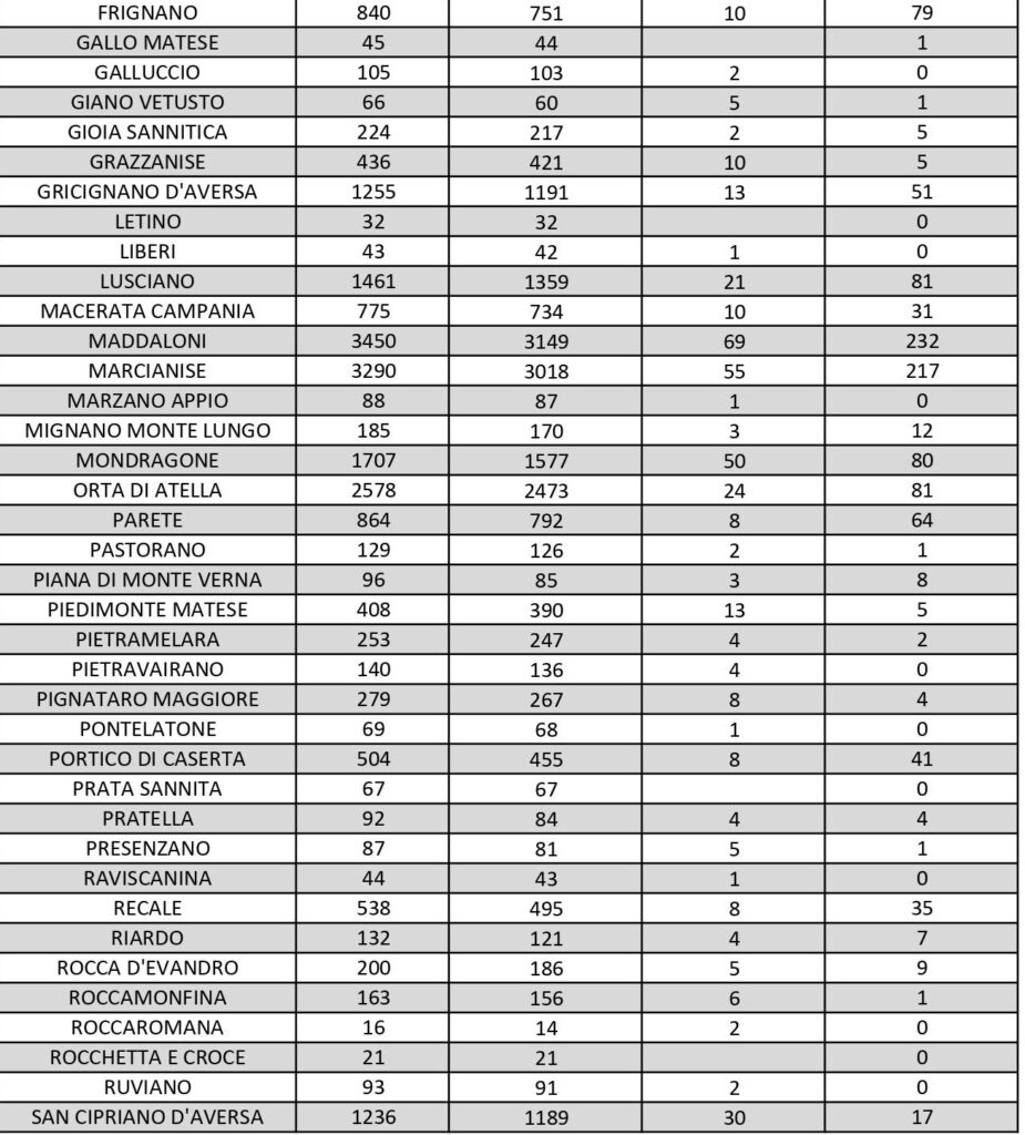 Al di fuori dell’Agro aversano, vanno segnalati i numeri relativi ad altri grossi centri della provincia, nei quali la situazione dei contagi attivi al momento è la seguente: ve ne sono 69 a Capua, 60 a Casagiove, 57 a Castel Volturno, 80 a Mondragone, 83 a San Felice a Cancello, 87 a San Nicola la Strada, 59 a Santa Maria a Vico, 76 a Santa Maria Capua Vetere e 26 a Sessa Aurunca.