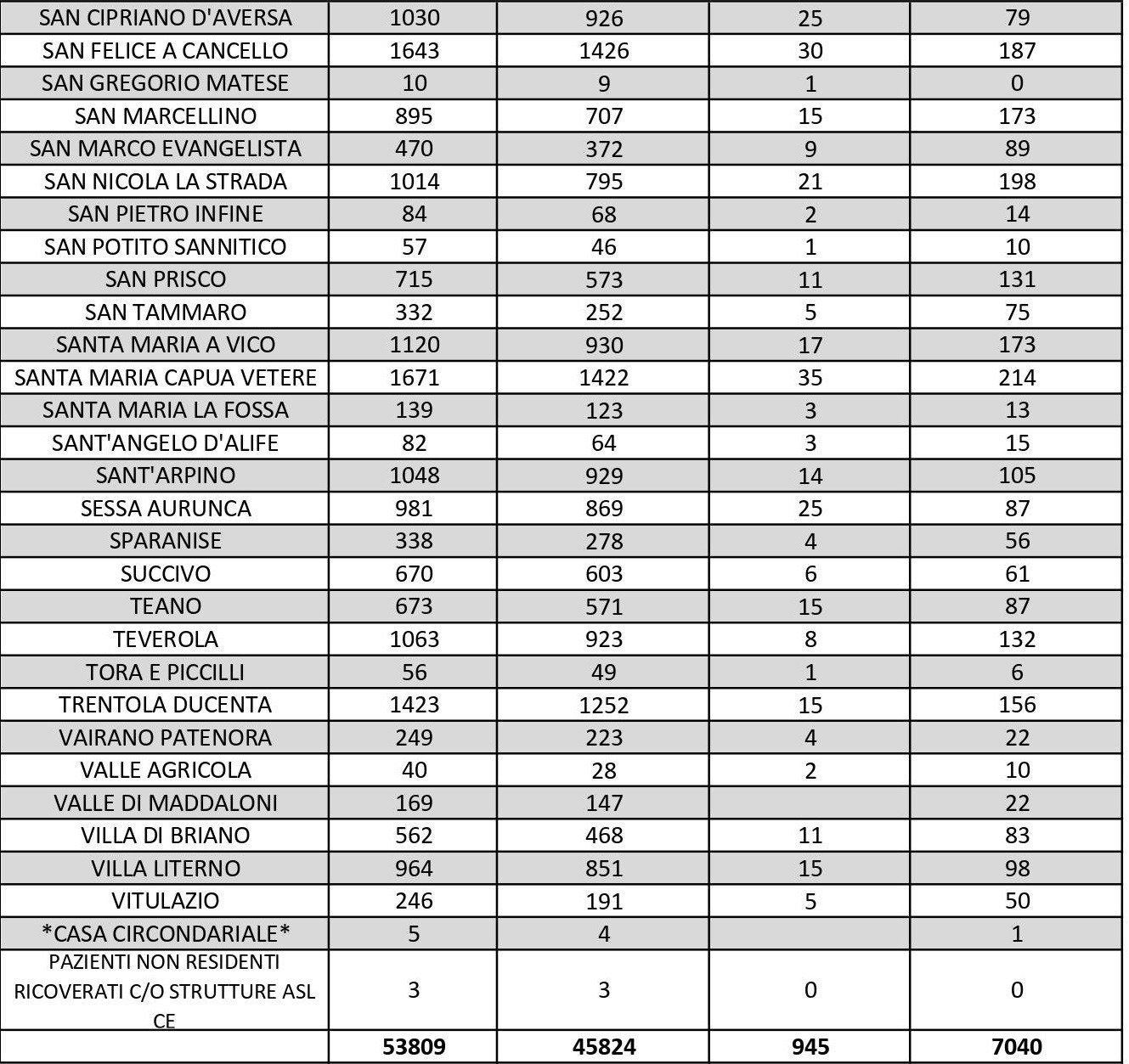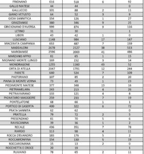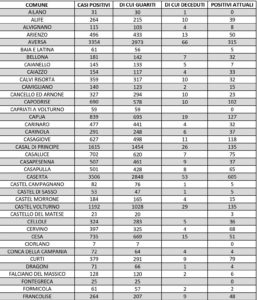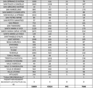 I numeri di Aversa vanno letti tenendo conto anche dei casi dei Comuni dell’intero Agro, area densamente popolata con i centri abitati tutti adiacenti tra loro. Questi i dati riferiti alle singole realtà territoriali: le persone attualmente positive sono 32 a Carinaro, 75 a Casaluce, 51 a Cesa, 116 a Gricignano d’Aversa, 147 a Lusciano, 109 a Parete, 173 a San Marcellino, 132 a Teverola e 156 a Trentola Ducenta. Negli altri centri la situazione è la seguente: Casal di Principe conta 135 contagi, Casapesenna 37, Frignano 92, San Cipriano d’Aversa 79, Sant’Arpino 105, Succivo 61, Villa di Briano 83 e Villa Literno 98.
