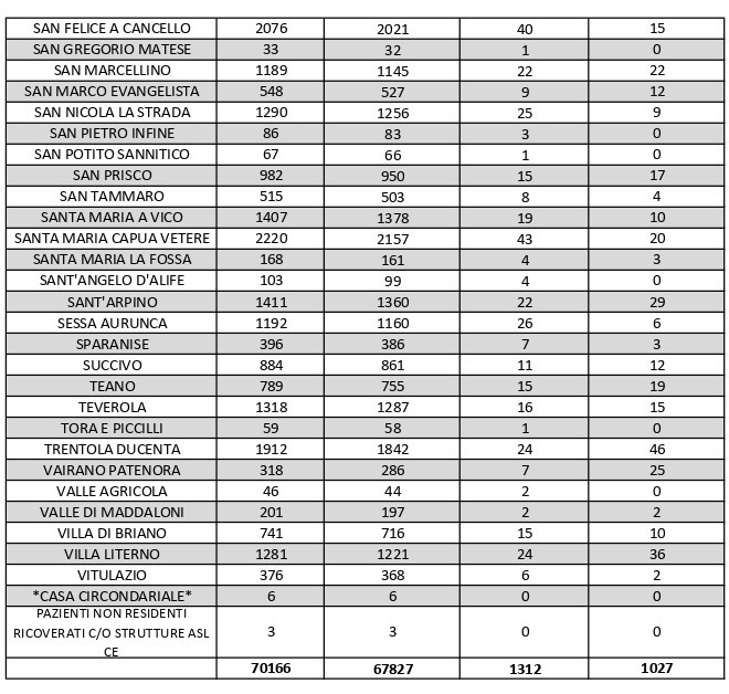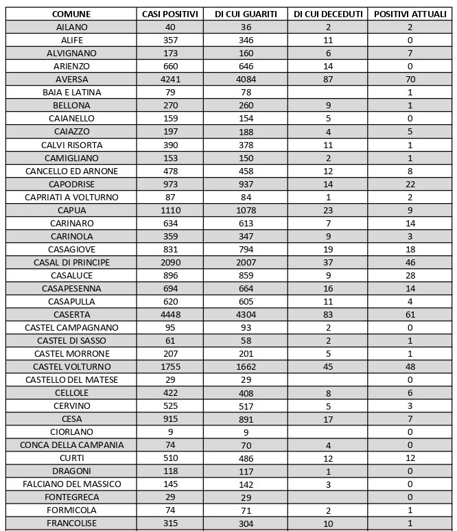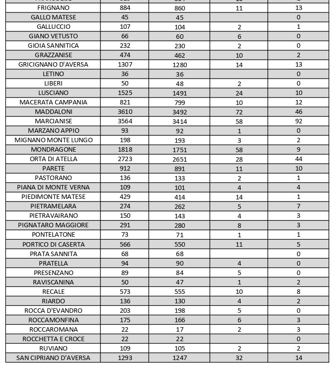 La città più colpita di tutta la provincia risulta essere Marcianise con 92 contagiati. Seguono: Aversa con 70 contagiati, Caserta con 61 contagiati, Casal di Principe con 46, Castel Volturno con 48 contagiati, Trentola Ducenta 46, Maddaloni con 46 contagiati, Orta di Atella con 44, Villa Literno con 36, a seguire l’elenco riportato.