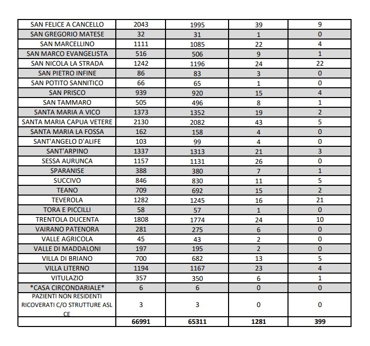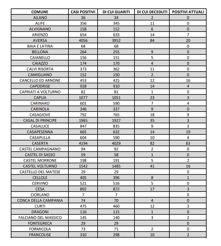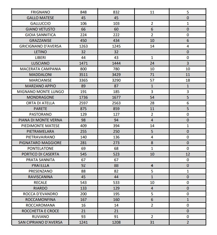 A oggi, in tutto il Casertano, si contano in totale 399 persone contagiate dall’infezione virale. Le persone completamente guarite dal Coronavirus invece, risultate quindi negative al doppio tampone dopo aver contratto la malattia, sono 14. Nelle ultime quarantott’ore si registra anche un decesso provocato dalle complicazioni del Sars-Cov-2. La città più colpita di tutta la provincia è Caserta, che registra attualmente 83 contagiati; seguono il capoluogo: San Nicola La Strada con 22 contagi, Teverola con 21, Aversa con 20 contagi, Casapesenna con 19, Marcianise con 18, Castel Volturno e Cancello ed Arnone entrambe con 16 contagi, Portico di Caserta con 12 e Maddaloni con 11 contagi.