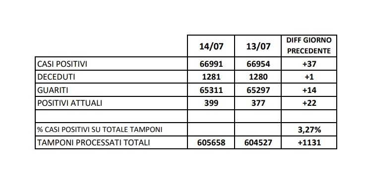 Il bollettino quotidiano diffuso oggi dall’Asl di Caserta sull’andamento dell’epidemia di Covid-19 in tutta la provincia evidenzia 37 nuovi casi positivi al virus su un totale di 1.131 tamponi giornalieri processati dalle strutture distrettuali sanitarie. Il tasso di positività si attesta oggi al 3,27%, per fortuna in discesa rispetto al tasso del 4,96% registrato nella giornata di ieri. Sotto la stretta osservazione da parte dei sanitari dell’Asl ci sono attualmente tre focolai virali scoppiati in diverse città della provincia, l’ultimo più recente verificatosi a Teverola, nell’Agro aversano, dove sono risultate positive al Covid-19 sedici persone, soprattutto bambini e ragazzi non vaccinati, residenti in uno stesso palazzo.