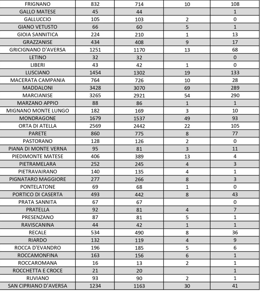 I dati di Aversa vanno letti tenendo conto anche dei casi nei Comuni dell’intero Agro, area densamente popolata con i centri abitati tutti adiacenti tra loro. Questi i dati riferiti alle singole realtà territoriali: le persone attualmente positive sono 33 a Carinaro, 34 a Casaluce, 40 a Cesa, 68 a Gricignano d’Aversa, 133 a Lusciano, 77 a Parete, 44 a Teverola. Negli altri centri la situazione è la seguente: Casal di Principe conta 45 contagi, Casapesenna 24, Frignano 108, Orta di Atella 105, San Cipriano d’Aversa 41, Sant’Arpino 74, Succivo 52, Villa di Briano 88 e Villa Literno 28.
