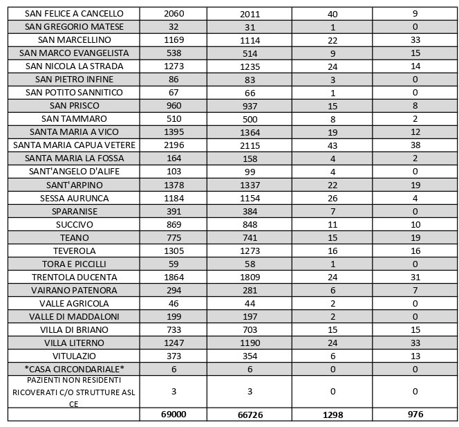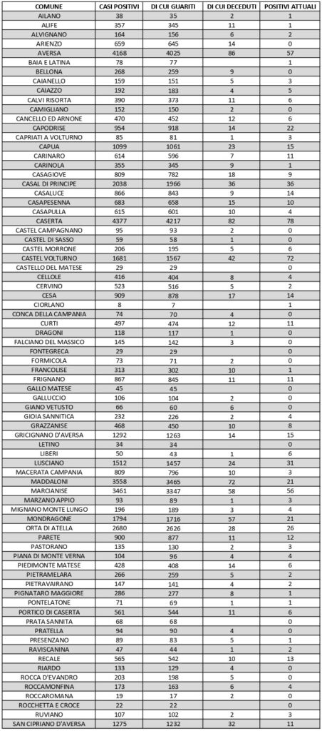 La città più colpita di tutta la provincia risulta essere Caserta, con 78 contagiati. Seguono: Castel Volturno con 72 contagiati, Aversa con 57 contagiati, Marcianise con 56 contagiati, Santa Maria Capua Vetere 38, Casal di Principe 36, San Marcellino e Villa Literno 33contagiati, a seguire l’elenco riportato.