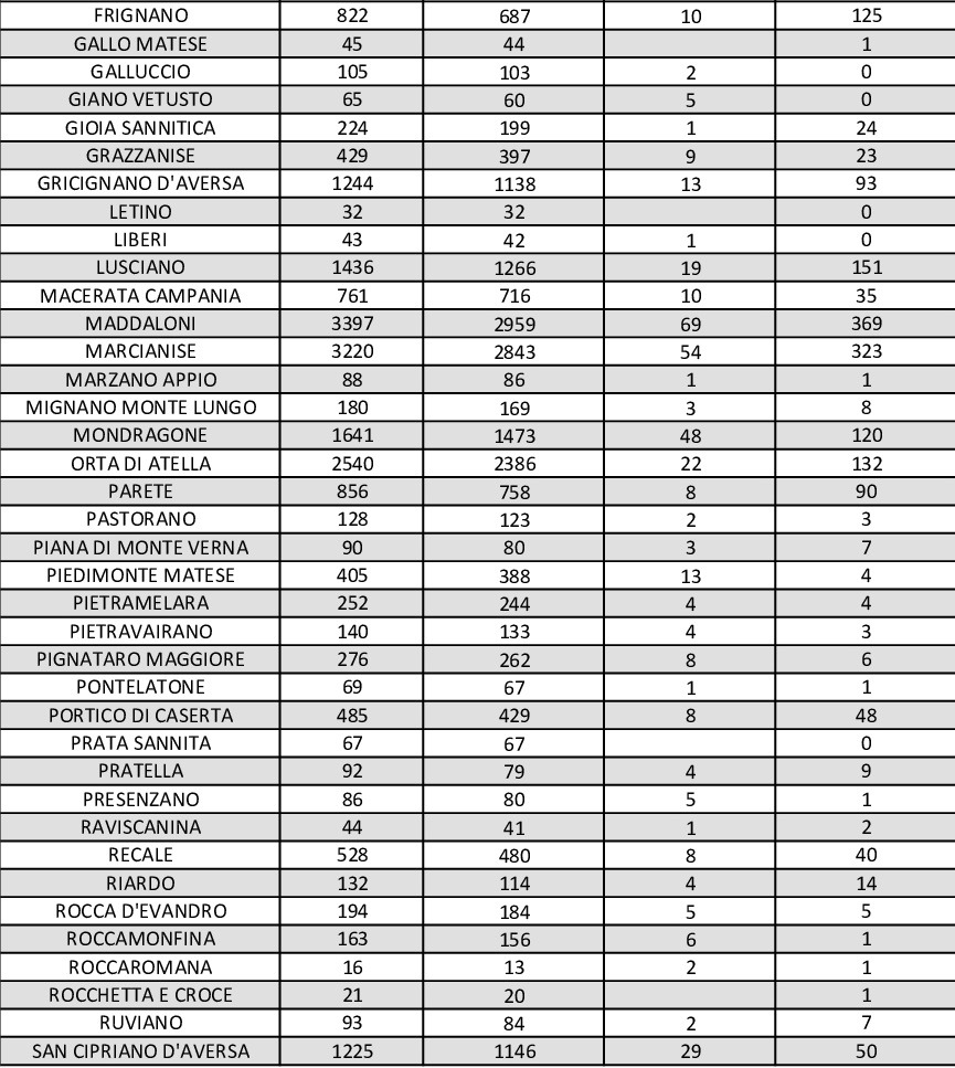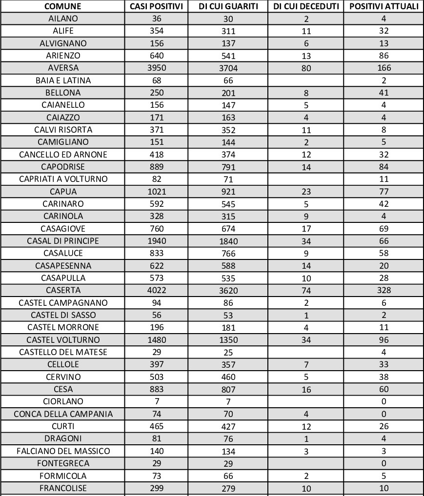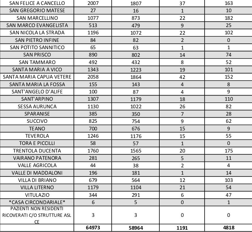 Al di fuori dell’Agro aversano, vanno segnalati i numeri relativi ad altri grossi centri della provincia, nei quali la situazione dei contagi attivi al momento è la seguente: ve ne sono 77 a Capua, 69 a Casagiove, 96 a Castel Volturno, 120 a Mondragone, 163 a San Felice a Cancello. 102 a San Nicola la Strada, 101 a Santa Maria a Vico, 152 a Santa Maria Capua Vetere e 82 a Sessa Aurunca.