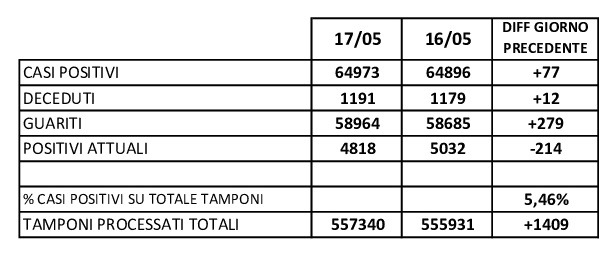 Covid-19 nel Casertano, 77 casi su 1.409 test effettuati con 279 guariti e 12 vittime