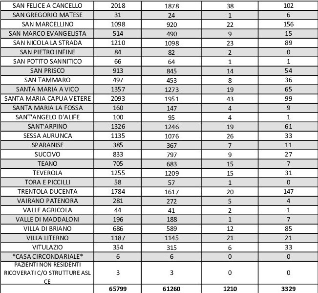 I dati di Aversa vanno letti tenendo conto anche dei casi nei Comuni dell’intero Agro, area densamente popolata con i centri abitati tutti adiacenti tra loro. Questi i dati riferiti alle singole realtà territoriali: le persone attualmente positive sono 20 a Carinaro, 29 a Casaluce, 13 a Cesa, 53 a Gricignano d’Aversa, 120 a Lusciano, 79 a Parete, 31 a Teverola. Negli altri centri la situazione è la seguente: Casal di Principe conta 31 contagi, Casapesenna 21, Frignano 107, Orta di Atella 91, San Cipriano d’Aversa 30, Sant’Arpino 61, Succivo 27, Villa di Briano 85 e Villa Literno 21.