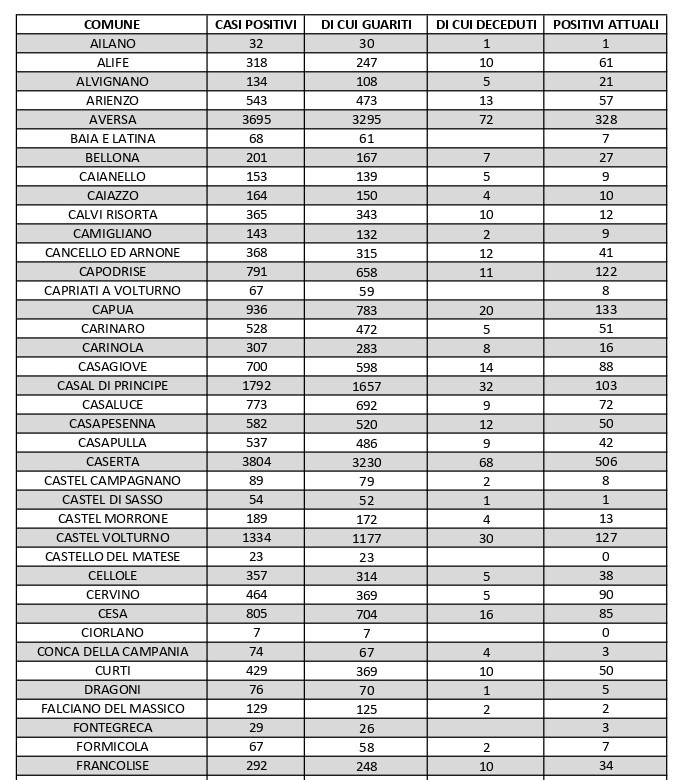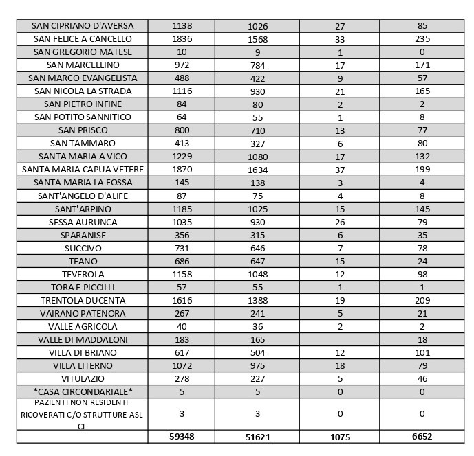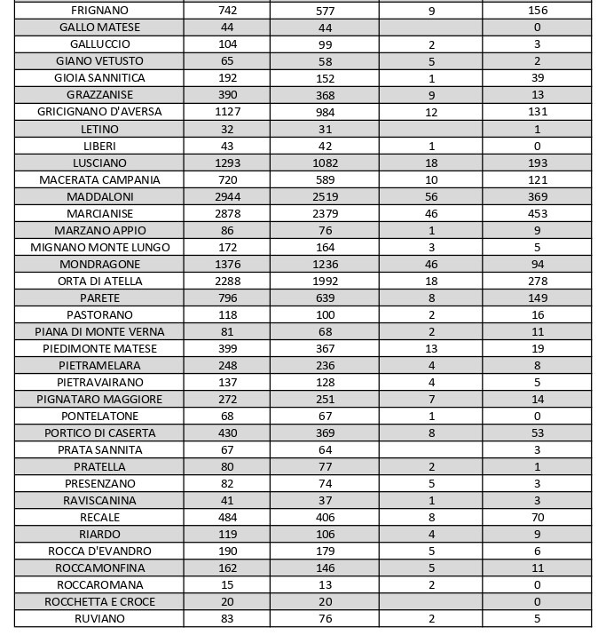 I numeri di Aversa vanno letti tenendo conto anche dei casi dei Comuni dell’intero Agro, area densamente popolata con i centri abitati tutti adiacenti tra loro. Questi i dati riferiti alle singole realtà territoriali: le persone attualmente positive sono 51 a Carinaro, 72 a Casaluce, 85 a Cesa, 131 a Gricignano d’Aversa, 193 a Lusciano, 149 a Parete, 171 a San Marcellino, 98 a Teverola e 209 a Trentola Ducenta. Nei centri siti ai margini dell’Agro aversano la situazione è la seguente: Casal di Principe conta 103 contagi, Casapesenna 50, Frignano 156, San Cipriano d’Aversa 85, Sant’Arpino 145, Succivo 78 e Villa di Briano 101.