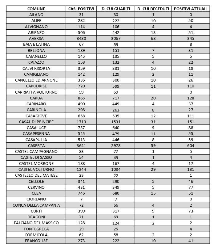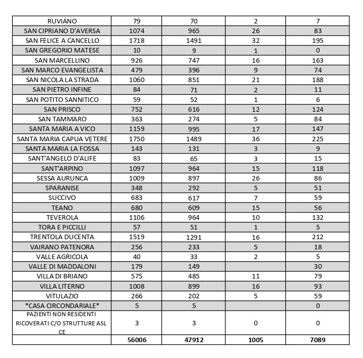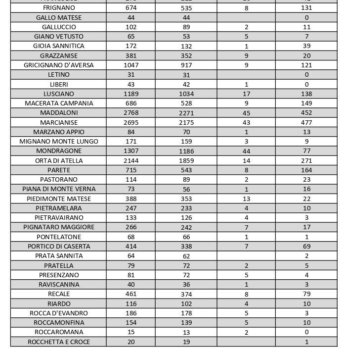 I numeri di Aversa vanno letti tenendo conto anche dei casi dei Comuni dell’intero Agro, area densamente popolata con i centri abitati tutti adiacenti tra loro. Questi i dati riferiti alle singole realtà territoriali: le persone attualmente positive sono 37 a Carinaro, 88 a Casaluce, 51 a Cesa, 121 a Gricignano d’Aversa, 138 a Lusciano, 164 a Parete, 163 a San Marcellino, 132 a Teverola e 212 a Trentola Ducenta. Nei centri siti ai margini dell’Agro aversano la situazione è la seguente: Casal di Principe conta 151 contagi, Casapesenna 55, Frignano 131, San Cipriano d’Aversa 83, Sant’Arpino 118, Succivo 59 e Villa di Briano 79.