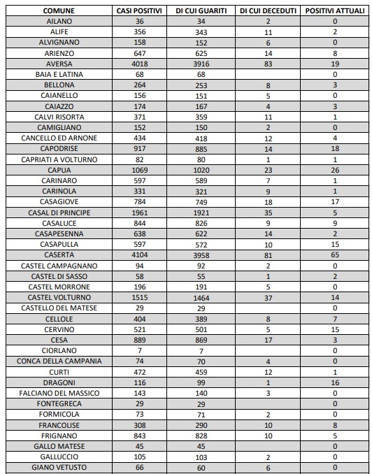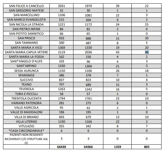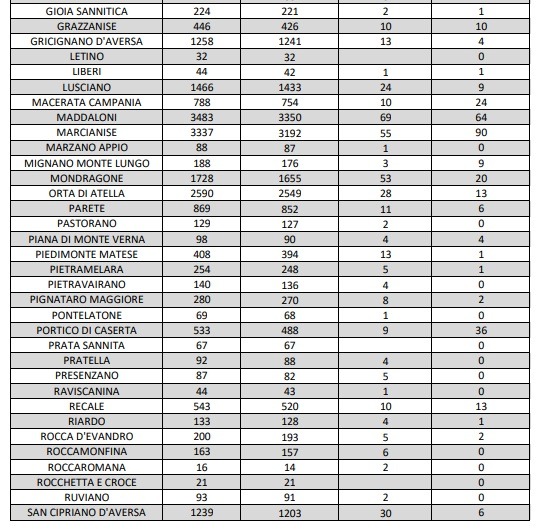 Nel bollettino odierno Caserta conta attualmente 65 positivi sebbene la città maggiormente colpita in tutta la provincia sia Marcianise con 90 contagiati seguite a ruota da Maddaloni con 64; seguono Santa Maria Capua Vetere con 40 positivi, Capua con 26 e San Nicola La Strada con 25. Ad Aversa si contano attualmente 19 positivi, dati che vanno letti tenendo conto anche dei casi nei Comuni dell’intero Agro aversano, area densamente popolata con i centri abitati che sono confinanti tra di loro. Questi i dati riferiti alle singole realtà territoriali: le persone attualmente positive sono una a Carinaro, 9 a Casaluce, 3 a Cesa, a Gricignano d’Aversa sono 4, a Lusciano 9, a Parete 6 e a Teverola 5. Negli altri centri la situazione è la seguente: Casal di Principe conta 5 contagi, Casapesenna 2, Frignano 5, San Cipriano d’Aversa 6, San Marcellino 3, Sant’Arpino 3, Trentola Ducenta 10, Succivo 4, Villa di Briano 10, Villa Literno 2 e Orta di Atella 13.