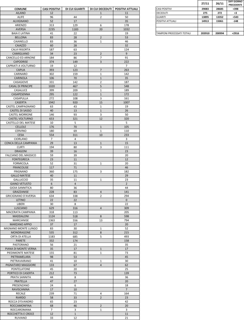 Il bollettino quotidiano diffuso dalla Asl di Caserta e aggiornato alle 10.45 di oggi fa emergere dati di segno positivo: nelle scorse ventiquattr’ore, infatti, in tutta la provincia sono stati registrati appena tre decessi a causa dell’infezione da Covid-19 e delle sue conseguenze. Il numero complessivo delle morti per Coronavirus in Terra di lavoro dall’inizio della pandemia a oggi sale, dunque, da 272 a 275. Dai rilievi effettuati nella giornata di ieri, sono emersi 398 nuovi positivi su 2.916 tamponi effettuati, con una percentuale quindi in calo e un totale che arriva a 29.083. Vi sono state, per fortuna, anche 543 guarigioni, che fanno ulteriormente calare il numero di coloro che sono attualmente positivi di 148 unità, dai 15.061 del 26 novembre ai 14.913 di ieri.