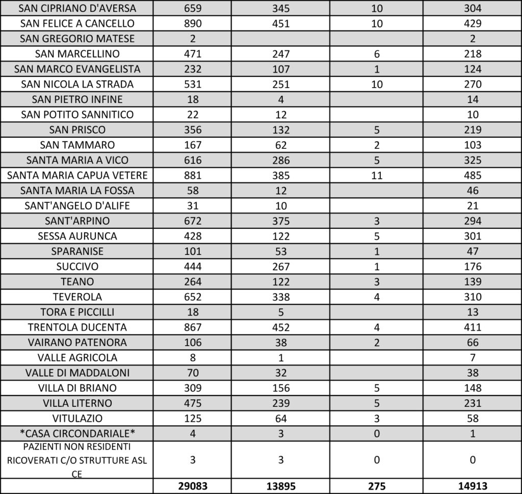 Nonostante numeri migliori rispetto a qualche giorno fa, anche nel bollettino odierno resta Aversa la città del Casertano col maggiore numero di casi di positività, 1.032, anche se rispetto a ventiquattr’ore prima, quando erano 1.063, il numero è calato grazie a ben 51 guarigioni a fronte di 20 nuovi positivi, senza alcun nuovo decesso (col numero complessivo che resta fermo a 20). Attenzione ancora alta anche nel resto dell’Agro aversano, a causa di una presenza del virus largamente diffusa anche nelle cittadine limitrofe, peraltro tutte adiacenti l’una all’altra senza alcuna soluzione di continuità, a formare un unico agglomerato urbano caratterizzato da notevole densità abitativa e interscambi continui tra le varie realtà territoriali. Così, a Carinaro gli attualmente positivi al Covid-19 sono 142, a Casal di Principe 548, a Casaluce 189, a Casapesenna 172, a Cesa 233, a Frignano 182, a Gricignano d’Aversa 294, a Lusciano 309, a Orta di Atella 493, a Parete 158. E ancora ve ne sono al momento 304 a San Cipriano d’Aversa, 218 a San Marcellino, 294 a Sant’Arpino, 176 a Succivo, 310 a Teverola e 411 a Trentola Ducenta, infine 148 a Villa di Briano.