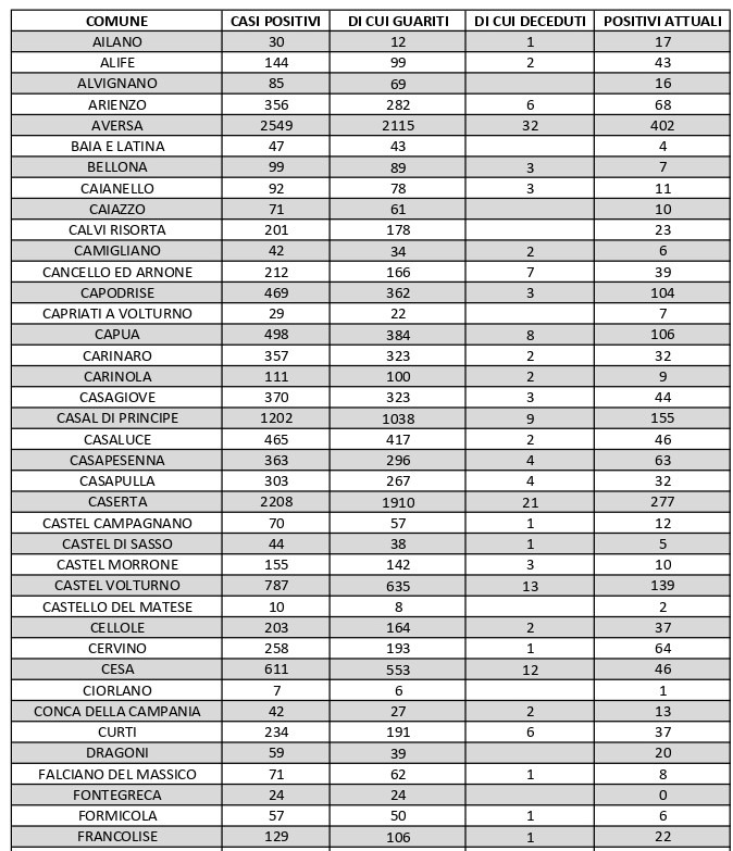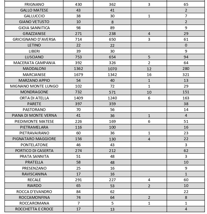 Il bollettino non registra variazioni nei contagi attivi nella città di Caserta, che come ieri ne conta attualmente 277. La città col maggiore numero di casi di positività in provincia resta, anche oggi, Aversa, che conta 402 casi, uno in più rispetto a ieri. Alle sue spalle c’è Marcianise, con 321 contagi. Occhi puntati ancora sull’Agro aversano, dove i centri abitati sono tutti adiacenti tra loro e il virus ha ancora una certa diffusione: Carinaro conta 32 positivi, Casal di Principe 155, Casaluce 46, Casapesenna 63, Cesa 46, Frignano 65, Gricignano d’Aversa 61, Lusciano 94, Orta di Atella 163, Parete 38, San Cipriano d’Aversa 91, San Marcellino 80, Sant’Arpino 97, Succivo 35, Teverola 80, Trentola Ducenta 111 e Villa di Briano 38.