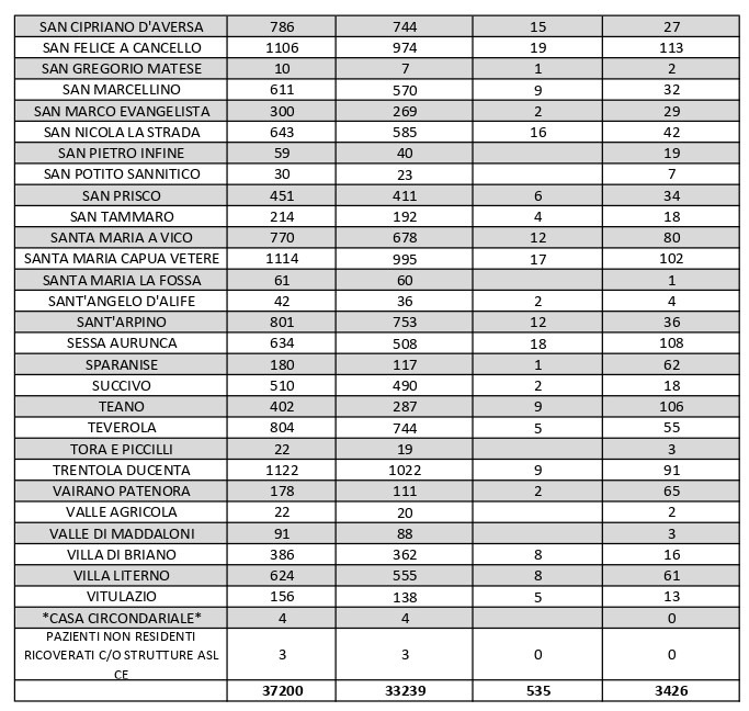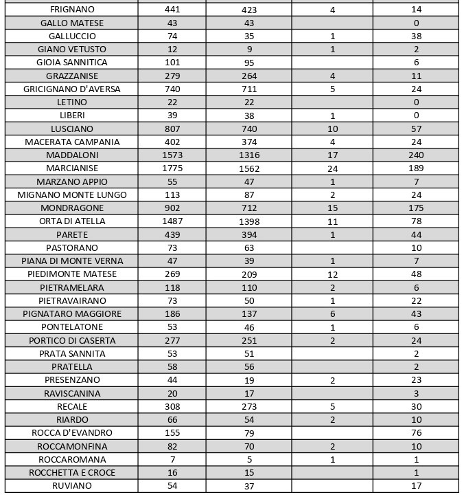 Al di fuori dell’Agro aversano, vanno segnalati i numeri relativi ad altri grossi centri della provincia, nei quali la situazione dei contagi attivi è la seguente: al momento ve ne sono 87 a Capua, 45 a Castel Volturno, 113 a San Felice a Cancello, 80 a Santa Maria a Vico, 102 a Santa Maria Capua Vetere, 108 a Sessa Aurunca, 106 a Teano e 61 a Villa Literno.