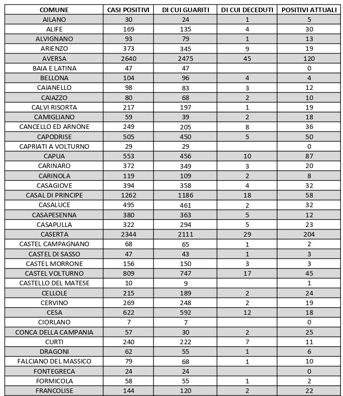 A livello regionale, sono stati registrati ancora 48 nuovi decessi. In Terra di lavoro, il maggior numero di contagi attualmente c'è a Maddaloni (240), nel capoluogo (204), Marcianise (189), Mondragone (175) e Aversa (120)