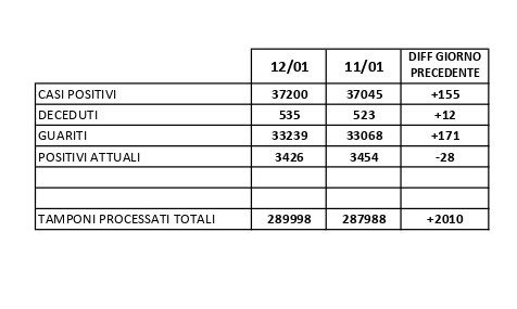 Per quanto riguarda il Casertano, il bollettino quotidiano diffuso dalla Asl di Caserta e aggiornato alle 12 delinea una situazione epidemiologica sostanzialmente stabile: su 2.010 tamponi, infatti, ne sono risultati positivi 155 e vi sono state anche 171 guarigioni. Purtroppo, nelle scorse ventiquattr’ore, in tutta la provincia sono stati registrati 12 nuovi decessi a causa dell’infezione da Covid-19 e delle sue conseguenze. Il numero complessivo delle morti per Coronavirus in Terra di lavoro dall’inizio della pandemia a oggi sale, dunque, da 523 a 535.
