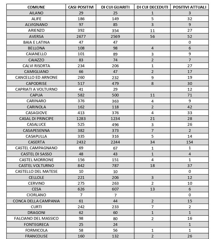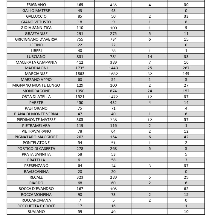 Per quanto riguarda l’Agro aversano, area densamente popolata con i centri abitati tutti adiacenti tra loro, ecco i dati riferiti alle singole realtà territoriali: Aversa conta 52 positivi, Carinaro 9, Casal di Principe 28, Casaluce 26, Casapesenna 2, Cesa 6, Frignano 30, Gricignano d’Aversa 15, Lusciano 33, Orta di Atella 37, Parete 14, San Cipriano d’Aversa 8, San Marcellino 4, Sant’Arpino 27, Succivo 14, Teverola 31, Trentola Ducenta 38 e Villa di Briano 8. Al di fuori dell’Agro aversano, vanno segnalati i numeri relativi ad altri grossi centri della provincia, nei quali la situazione dei contagi attivi al momento è la seguente: ve ne sono 71 a Capua, 37 a Castel Volturno, 118 a San Felice a Cancello, 45 a Santa Maria a Vico, 44 a Santa Maria Capua Vetere, 100 a Sessa Aurunca, 113 a Teano e 43 a Villa Literno.