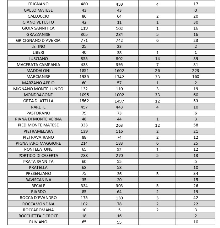 Al di fuori dell’Agro aversano, vanno segnalati i numeri, anche in questo caso più o meno stabili, relativi ad altri grossi centri della provincia, nei quali la situazione dei contagi attivi al momento è la seguente: ve ne sono 73 a Capua, 51 a Casagiove, 62 a Castel Volturno, 60 a Mondragone, 42 a Rocca d’Evandro, 44 a San Nicola la Strada, 66 a Santa Maria a Vico, 53 a Santa Maria Capua Vetere, 139 a Sessa Aurunca, 131 a Teano e 37 a Villa Literno.