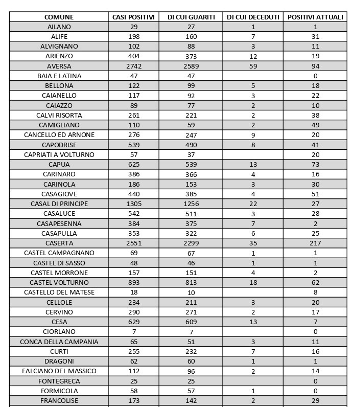 I nuovi decessi registrati sul territorio regionale sono 13. In provincia di Caserta, il centro con più positivi attivi resta Maddaloni, che ne conta 223. Seguono il capoluogo (217), San Felice a Cancello (177) e Marcianise (160)